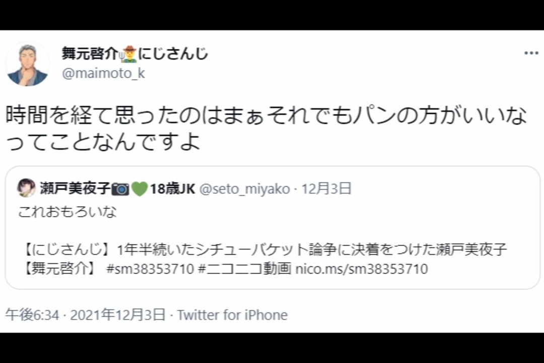 これでも責任の一端を感じています。<br>前回のシチューバゲット論争→<a href="https://www.nicovideo.jp/watch/sm38353710" class="watch">sm38353710</a><br><br>(皆様のチャンネル登録・ツイッターフォローをお願いいたします)<br>【舞元啓介】<br>◆youtube : <a href="https://www.youtube.com/channel/UCJubINhCcFXlsBwnHp0wl_g" target="_blank" rel="noopener nofollow">https://www.youtube.com/channel/UCJubINhCcFXlsBwnHp0wl_g</a><br>◆twitter : <a href="https://twitter.com/maimoto_k" target="_blank" rel="noopener nofollow">https://twitter.com/maimoto_k</a><br><br>【瀬戸美夜子】<br>◆youtube : <a href="https://www.youtube.com/channel/UCHK5wkevfaGrPr7j3g56Jmw" target="_blank" rel="noopener nofollow">https://www.youtube.com/channel/UCHK5wkevfaGrPr7j3g56Jmw</a><br>◆twitter : <a href="https://twitter.com/seto_miyako" target="_blank" rel="noopener nofollow">https://twitter.com/seto_miyako</a><br><br>【甲斐田晴】<br>◆youtube : <a href="https://www.youtube.com/channel/UCo2N7C-Z91waaR6lF3LL_jw" target="_blank" rel="noopener nofollow">https://www.youtube.com/channel/UCo2N7C-Z91waaR6lF3LL_jw</a><br>◆twitter : <a href="https://twitter.com/Kaida_Haru" target="_blank" rel="noopener nofollow">https://twitter.com/Kaida_Haru</a><br><br>【鷹宮リオン】<br>◆youtube : <a href="https://www.youtube.com/channel/UCV5ZZlLjk5MKGg3L0n0vbzw" target="_blank" rel="noopener nofollow">https://www.youtube.com/channel/UCV5ZZlLjk5MKGg3L0n0vbzw</a><br>◆twitter : <a href="https://twitter.com/TakamiyaRion" target="_blank" rel="noopener nofollow">https://twitter.com/TakamiyaRion</a>