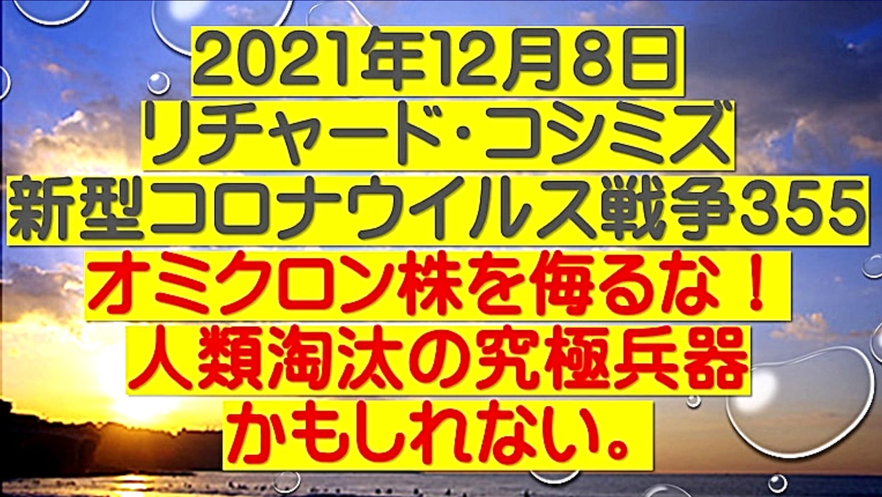 <span style="color: #cc4125;"><strong>「 テーマ:新型コロナウイルス戦争 355 」</strong></span><br><br><span style="color: #ff0000;"><strong>「『 オミクロン株 』を侮るな!人類淘汰の究極兵器かもしれない 」</strong></span><br><br> ◆リチャード・コシミズ 著作 「超・特効薬 イベルメクチン」 2021年12月16日 発売予定<br><br> ◆新型コロナワクチンを打たずに、「イベルメクチン・アビガンを予防投与」するべきである。<br> そうすれば、コロナ禍は自然に消えていく。<br><br> ◆万が一、新型コロナに感染した場合、イベルメクチンを服用すれば、ほぼ完全に治癒する。<br><br> ◆社会的圧力等により、新型コロナワクチンを打たざるを得ない場合、ワクチンを打つ前にイベ<br> ルメクチンを服用しておけば、体内におけるスパイクタンパク産生を阻止することができる。<br><br> ◆新型コロナウイルスとワクチンは、同じ構造である。イベルメクチンで、体内でのスパイクタ<br> ンパク産生を阻止しなければ、いずれは血栓症になり、最終的には死亡する。<br><br> ◆イベルメクチン・アビガンが承認されないのは、製薬会社の利権が原因ではない。<br> 殺人ワクチンで、人類を虐殺するためである。<br><br><span style="color: #38761d;">◆</span><span style="color: #38761d;"><strong>リチャード・コシミズ 公式 ブログ</strong></span><br> <a href="https://ameblo.jp/richardneversurrender/" target="_blank" rel="noopener nofollow">https://ameblo.jp/richardneversurrender/</a><br><br><span style="color: #38761d;">◆</span><span style="color: #38761d;"><strong>リチャード・コシミズ 公式 ホームページ</strong></span><br> <a href="http://richardkoshimizu.boo.jp/" target="_blank" rel="noopener nofollow">http://richardkoshimizu.boo.jp/</a><br><br><span style="color: #38761d;">◆</span><span style="color: #38761d;"><strong>リチャード・コシミズ 講演会 公式 動画ギャラリー</strong></span><br> <a href="http://www.t-sskk.com/richardkoshimizu/video-gallery/index.html" target="_blank" rel="noopener nofollow">http://www.t-sskk.com/richardkoshimizu/video-gallery/index.html</a><br>