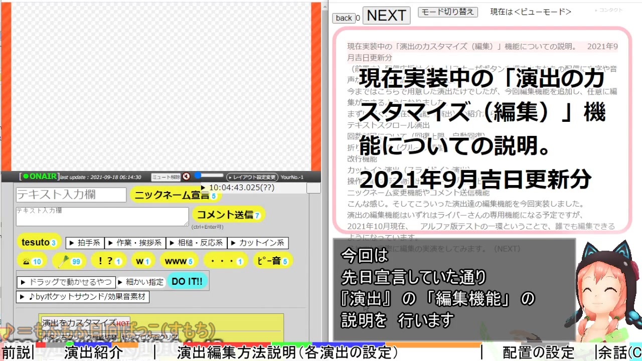 「配信応援サイト」の「演出編集機能」の説明動画になります。(2021年9月吉日段階)<br><br>我らが「配信応援サイト」についに「演出編集機能」が実装されたところですが、<br>前回動画:<a href="https://www.nicovideo.jp/watch/sm39436871" class="watch">sm39436871</a><br>で宣言していた通り、今回は演出の編集方法のより詳しい説明動画になります。<br><br><br>---<br>【宣伝】<br>配信応援サイト:<a href="https://cheerzon.jpn.org" target="_blank" rel="noopener nofollow">https://cheerzon.jpn.org</a><br>OBSへの導入方法:<a href="https://www.nicovideo.jp/watch/sm38897208" class="watch">sm38897208</a><br><br>やりたいこと+自己紹介の動画:<a href="https://www.nicovideo.jp/watch/sm36512685" class="watch">sm36512685</a><br>投銭サイト概要動画:<a href="https://www.nicovideo.jp/watch/sm36906971" class="watch">sm36906971</a><br><br>その他諸々の情報など、Twitterからたどればなんやかんやで繋がってると思いますので、ご興味の勝る方は是非どうぞ!( Twitter:<a href="https://twitter.com/sikozon" target="_blank" rel="noopener nofollow">https://twitter.com/sikozon</a> )<br><br><br>---<br><br>【当動画利用素材など】(順不同)<br>(※動画内クレジットシーン:<a href="#" class="seekTime" data-seekTime="20:16" onclick="seekNicoPlayer('#20:16'); return false;">#20:16</a>)<br><br>■ニコニコ関連<br>・鷺宮カノVRM:<a href="https://3d.nicovideo.jp/works/td35031" target="_blank" rel="noopener">td35031</a><br>・VDRAW:<a href="https://www.nicovideo.jp/watch/sm36597598" class="watch">sm36597598</a><br><br>▼SE<br>「効果音辞典」様:<a href="https://sounddictionary.info" target="_blank" rel="noopener nofollow">https://sounddictionary.info</a><br>「効果音ラボ」様:<a href="https://soundeffect-lab.info" target="_blank" rel="noopener nofollow">https://soundeffect-lab.info</a><br>「google翻訳」様:<a href="https://translate.google.co.jp" target="_blank" rel="noopener nofollow">https://translate.google.co.jp</a><br><br>▼BGM<br>「DOVA-SYNDROME」様:<a href="https://dova-s.jp" target="_blank" rel="noopener nofollow">https://dova-s.jp</a><br>「Music-Note.jp」様:<a href="https://www.music-note.jp" target="_blank" rel="noopener nofollow">https://www.music-note.jp</a><br><br>▼画像<br>「いらすとや」様:<a href="https://www.irasutoya.com" target="_blank" rel="noopener nofollow">https://www.irasutoya.com</a><br><br>▼ソフトウェア<br>AviUtl(KENくん様):<a href="http://spring-fragrance.mints.ne.jp/aviutl/" target="_blank" rel="noopener nofollow">http://spring-fragrance.mints.ne.jp/aviutl/</a><br>OBS Studio(jim様、OBS Studio Contributors様):<a href="https://obsproject.com" target="_blank" rel="noopener nofollow">https://obsproject.com</a><br>棒読みちゃん(みちあき様):<a href="https://chi.usamimi.info/Program/Application/BouyomiChan/" target="_blank" rel="noopener nofollow">https://chi.usamimi.info/Program/Application/BouyomiChan/</a><br>簡易プレゼンツール(仮称)(嗜好領域):<a href="https://cheerzon.jpn.org/sikoview.html" target="_blank" rel="noopener nofollow">https://cheerzon.jpn.org/sikoview.html</a><br><br><br>前回動画:<a href="https://www.nicovideo.jp/watch/sm39436871" class="watch">sm39436871</a>