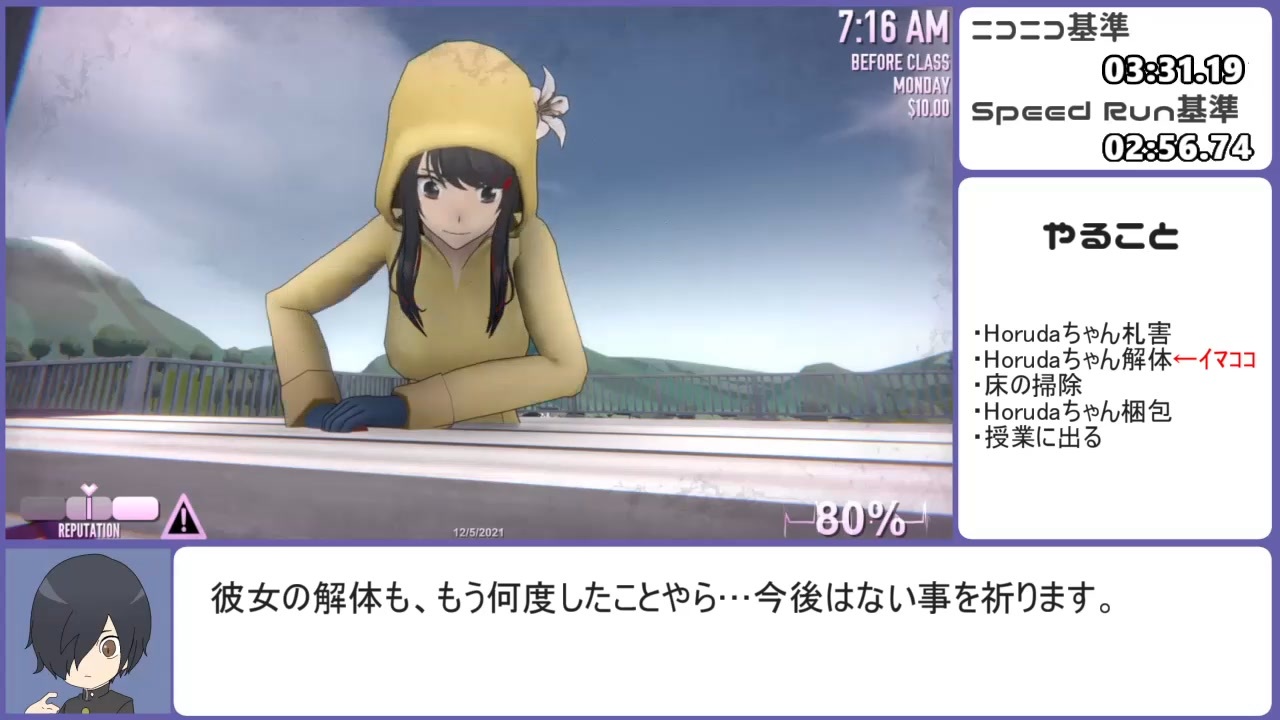 お願いされたので初投稿です。<br><br><br>タイマースタート:空ファイル選択<br>タイマーストップ:日付変更<br><br>レギュレーション<br>・Horudaちゃんを解体する<br>・警察を呼ばれない<br>・評判を初期値未満にしない<br>・正気度を100%未満にしない<br>・不審行動の目撃者は生かさない<br>・ヤンデレ加速禁止<br><br>先駆者・ヒカリモノ兄貴(<a href="https://www.nicovideo.jp/watch/sm39719581" class="watch">sm39719581</a>)<br><br><br><span style="font-size: 18px;"><strong>刮目したまえ、これが真のガバだ。</strong></span><br><br><br>【追記】<br>σ軸様、しじみ様、ALIPRO様、うお座様、ゾーク様、Noron様、Lui様、れうすき様、うぅ...♡様、鉈風様、シロホシ様、海馬すずめ様、ミィーシャル様、Ri__________n様、芋丼様、ヒカリモノ様、ヒカリモノ(稚魚)様、Chojo Tekina様、なおし様、Borupen Saishiki様、おぱんつ大好き丸様、一般オカルト部員様、夢見様、どくけしそう様、昼間飛行様、法軍寺望友様、acv(アカワ)様、春巻様、眼鏡っ子崇拝様、るとジウム様、ソルガレオ様、ルナアーラ様、ネクロズマ様、ウツロイド様、マッシブーン様、フェローチェ様、デンジュモク様、カミツルギ様、テッカグヤ様、アクジキング様、アーゴヨン様、ズガドーン様、ツンデツンデ様、オールドキング様、広告ありがとうございます!<br><br>法軍寺望友姉貴兄貴(<a href="https://www.nicovideo.jp/watch/sm39733224" class="watch">sm39733224</a>)によって、投稿からたった2時間5分でChojoくんのお尻が攻略されたの本当に草。