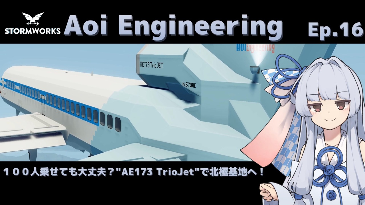 <strong>Ep.16 100人乗せても大丈夫?"AE173 TrioJet"で北極基地へ!</strong><br><br>客席数が100を超えたら100人乗せてみたいよね…ということで、100人のせちゃいました!重いし乗せる数は多いしでとってもしんどかった…orz<br>おかげさまで動画投稿100本目を迎えました。引き続き楽しんでもらえるような動画を作れたらなと思ってます。よろしくお願いいたします…!<br>前回せっかく作った空港( <a href="https://www.nicovideo.jp/watch/sm39653440" class="watch">sm39653440</a> )も負荷で使えませんでした。しかたないね!<br>オーバブッキングしちゃってるけどベテランの<span style="color: #efefef;"><s>天災</s></span>天才社長葵ちゃんは賢い方法で全員載せていきます。<br><br>今回ご紹介した支援絵は下記リンクよりどうぞ!<br>『AoiEngineering社の急速な事業拡大を祝して』 <a href="https://seiga.nicovideo.jp/seiga/im10846026" target="_blank" rel="noopener">im10846026</a><br>論外@Nsen01避難所オーナー さん <a href="https://www.nicovideo.jp/user/26906638" target="_blank" rel="noopener">user/26906638</a><br><br>〇ワタリドリのカラオケ音源<br>カラオケ歌っちゃ王<br><a href="https://www.youtube.com/channel/UC1tk9F5-MGXEq4LWnjmrtpA" target="_blank" rel="noopener nofollow">https://www.youtube.com/channel/UC1tk9F5-MGXEq4LWnjmrtpA</a><br><br>おうたのFull版上げました→ <a href="https://www.nicovideo.jp/watch/sm39791673" class="watch">sm39791673</a><br><br><br>このゲームはStormworks:Build and Rescue : <a href="https://store.steampowered.com/app/573090/Stormworks_Build_and_Rescue/" target="_blank" rel="noopener nofollow">https://store.steampowered.com/app/573090/Stormworks_Build_and_Rescue/</a><br><br>この動画シリーズ : <a href="https://www.nicovideo.jp/series/126180" target="_blank" rel="noopener">series/126180</a><br>このシリーズでいただいたニコ静支援絵クリップ : <a href="https://seiga.nicovideo.jp/clip/3233979" target="_blank" rel="noopener">clip/3233979</a>
