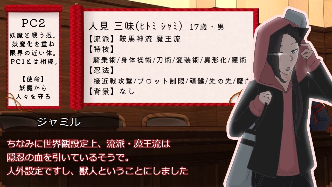 チュートリアル動画です、シノビガミのルールをご存じない方向け。<br>ご存じの方は戦闘だけでも楽しんでいってください。<br>今回でおおまかなゲームの用語などを確認いただいた上で、セッションは次回以降。<br><br><a href="#" class="seekTime" data-seekTime="1:30" onclick="seekNicoPlayer('#1:30'); return false;">#1:30</a> ハンドアウト<br><a href="#" class="seekTime" data-seekTime="2:50" onclick="seekNicoPlayer('#2:50'); return false;">#2:50</a> キャラクターシート項目<br><a href="#" class="seekTime" data-seekTime="5:56" onclick="seekNicoPlayer('#5:56'); return false;">#5:56</a> セッションの流れ<br><a href="#" class="seekTime" data-seekTime="8:27" onclick="seekNicoPlayer('#8:27'); return false;">#8:27</a> 出来上がったPC紹介(セッションは次回以降)<br><a href="#" class="seekTime" data-seekTime="12:09" onclick="seekNicoPlayer('#12:09'); return false;">#12:09</a> 模擬戦闘<br><br><span style="font-size: 14px;">「ココ口スト」:<a href="https://www.nicovideo.jp/watch/sm39780797" class="watch">sm39780797</a>(サバナ組)</span><br><br>---------------------------------------------------------------<br><br>※仮想卓です(ダイスは振ってます。また、戦闘運用は手伝ってもらっています)<br>※捏造もりもり、好き勝手大暴れキャラ解釈&世界観<br>※シノビガミのざっくりした説明のつもりが、却ってややこしいかもしれません。<br> あまり厳密に理解しようとせず、雰囲気をお楽しみ下さい<br>※キャラの発言量には若干の偏りが存在します<br>※ルール間違いへのご指摘などは優しくしていただければ幸いです<br><br>以上、ご許容頂ける方のみご視聴下さい。<br><br><span style="font-size: 10px;">シノビガミはいいぞ<br>今回調声してないです、聞きづらかったらすいません!</span><br><br>