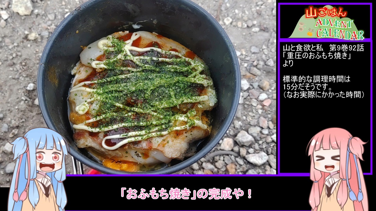 本動画は<strong>「山ごはんアドベントカレンダー」</strong>15日目の動画です。<br><span style="color: #ff0000;"><strong>山ごはんアドベントカレンダーマイリスト:<a href="https://www.nicovideo.jp/mylist/72244660" target="_blank" rel="noopener">mylist/72244660</a><br>前走者 おおやけさん:<a href="https://www.nicovideo.jp/watch/sm39743741" class="watch">sm39743741</a><br>次走者 までぃさん :<a href="https://www.nicovideo.jp/watch/sm39759062" class="watch">sm39759062</a></strong></span><br>16日目はいったんリザーバーの方に参戦いただくこととなりました。<br><br><span style="color: #0000ff;"><strong><祭の概要><br>主催:瓢箪屋様(<a href="https://www.nicovideo.jp/user/632478" target="_blank" rel="noopener">user/632478</a>)<br>告知:<a href="https://www.nicovideo.jp/watch/sm39661020" class="watch">sm39661020</a>(レギュもこちら参照)</strong></span><br><br><span style="color: #9900ff;"><strong><この動画><br>料理:おふもち焼き<br>出典:「山と食欲と私」第9巻 「重圧のおふもち焼き」より<br>山:白髪岳(兵庫県丹波篠山市)</strong></span><br><br><strong>前→<a href="https://www.nicovideo.jp/watch/sm38971934" class="watch">sm38971934</a><br>次→そのうち</strong><br><br><食材><br>車麩、豚バラ肉、スライス餅、卵、おたふくソース、マヨネーズ、青のり、粉末だし<br>※本来はここにサクラエビと削り節もあるとよい<br><br><関連シリーズ><br>山と食欲と琴葉姉妹:<a href="https://www.nicovideo.jp/mylist/72091385" target="_blank" rel="noopener">mylist/72091385</a><br>RTA(リアル登山アタック):<a href="https://www.nicovideo.jp/mylist/64148970" target="_blank" rel="noopener">mylist/64148970</a><br>VOICEROIDキッチン:<a href="https://www.nicovideo.jp/mylist/67870629" target="_blank" rel="noopener">mylist/67870629</a><br><br>ついった:<a href="https://twitter.com/felpurrninja" target="_blank" rel="noopener nofollow">https://twitter.com/felpurrninja</a><br><br><span style="font-size: 16px;"><strong>ところで!<br>実況者杯って言うすごく楽しみなイベントもあるんですよ(雑過ぎる便乗)<br>告知→<a href="https://www.nicovideo.jp/watch/sm39787857" class="watch">sm39787857</a></strong></span><br><br>視聴者も参加者も来て、どうぞ。<br><br><使わせていただいたもの→コンテンツツリーから!><br>VOICEROID:琴葉茜、琴葉葵<br>キャラ:<a href="https://seiga.nicovideo.jp/seiga/im5274301" target="_blank" rel="noopener">im5274301</a>、<a href="https://seiga.nicovideo.jp/seiga/im5332607" target="_blank" rel="noopener">im5332607</a>(新島秋一様)<br>BGM:<a href="https://commons.nicovideo.jp/works/nc43122" target="_blank" rel="noopener">nc43122</a>、<a href="https://commons.nicovideo.jp/works/nc109159" target="_blank" rel="noopener">nc109159</a>、<a href="https://commons.nicovideo.jp/works/nc11577" target="_blank" rel="noopener">nc11577</a>、<a href="https://commons.nicovideo.jp/works/nc98117" target="_blank" rel="noopener">nc98117</a><br>素材:<a href="https://commons.nicovideo.jp/works/nc258113" target="_blank" rel="noopener">nc258113</a>