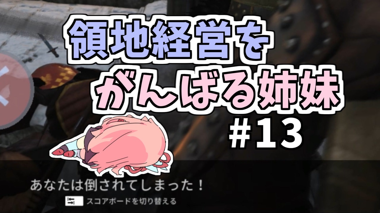 「ヘルメットが無かったら即死だったぜ。」<br>「ずんだをどうぞー。傷の回復にはずんだですよ!」<br>「衛兵、今後は占拠したら陛下が超えないように柵を多めに打ち付けておく様に。」<br><br>1.6.4でのプレイになります!<br>マウブレ2(Mount&Blade2:bannerlord)をサンドボックスモードで解説しながらプレイします。<br>アーリーアクセスゲームなので今後のアップデート次第では攻略情報がすぐに使えなくなる可能性があります。<br>果たして姉妹は正式版までに諸外国と渡り合える強国を築き上げる事が出来るのか?琴葉姉妹の冒険は続く!<br>※特に効率プレイではないので寄り道する事が多々あるよ!<br><br>縛り内容:鍛冶、処刑の禁止<br>使用mod:日本語化のみ<br><br>この動画のマイリス → <a href="https://www.nicovideo.jp/mylist/71843501" target="_blank" rel="noopener">mylist/71843501</a><br>part1へ → <a href="https://www.nicovideo.jp/watch/sm39362832" class="watch">sm39362832</a><br><br><a href="https://www.nicovideo.jp/watch/sm39713898" class="watch">sm39713898</a> ← 前 #12|| #14 次 → <a href="https://www.nicovideo.jp/watch/sm39813933" class="watch">sm39813933</a>