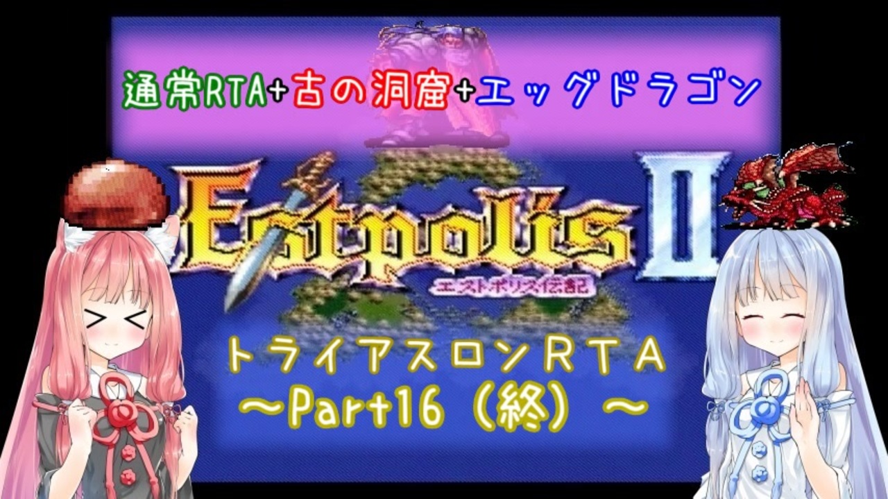 うp主「2年4ヶ月もの間、応援ありがとうございました」<br>葵「なんらかの形でまた戻ってきたいと思います」<br>茜「みんなまたなー!」<br><br>トライアスロンRTAを琴葉姉妹に実況解説してもらいました。<br>シュマン島・封印の塔 ガデス戦~THE ENDまで。+クリアレポートも。<br><br>※トライアスロンRTAレギュレーション<br>電源ONから計測開始~THE END表示まで<br>途中で「古の洞窟のぬし」「エッグドラゴン」を撃破すること<br>禁止事項:<br>・「もういちど」モードの使用<br>・古の洞窟「ぬし」戦で全滅する<br>・エッグドラゴン戦で「敵HPオーバーフローバグ」の使用<br><br>【追記】Part6以降のタイマーに編集ミスがありました。<br>測定し直した結果、記録は<span style="color: #ff0000;"><strong>7:17:12</strong></span>です。<br><br><a href="https://www.nicovideo.jp/watch/sm39743002" class="watch">sm39743002</a><span style="color: #000000;"> ←前回 次回→ </span>これでおしまい。<br><br />~過去に投稿した動画シリーズ~<br>ランダム封印縛り <a href="https://www.nicovideo.jp/series/223931" target="_blank" rel="noopener">series/223931</a><br>状況再現有り通常RTA <a href="https://www.nicovideo.jp/series/210110" target="_blank" rel="noopener">series/210110</a><br>エグドラRTA <a href="https://www.nicovideo.jp/series/141073" target="_blank" rel="noopener">series/141073</a> <a href="https://www.nicovideo.jp/series/196869" target="_blank" rel="noopener">series/196869</a><br>ガデスRTA <a href="https://www.nicovideo.jp/series/126434" target="_blank" rel="noopener">series/126434</a><br>もういちどRTA <a href="https://www.nicovideo.jp/series/70185" target="_blank" rel="noopener">series/70185</a><br>通常RTA <a href="https://www.nicovideo.jp/series/63156" target="_blank" rel="noopener">series/63156</a><br>いにしえRTA <a href="https://www.nicovideo.jp/series/53235" target="_blank" rel="noopener">series/53235</a>