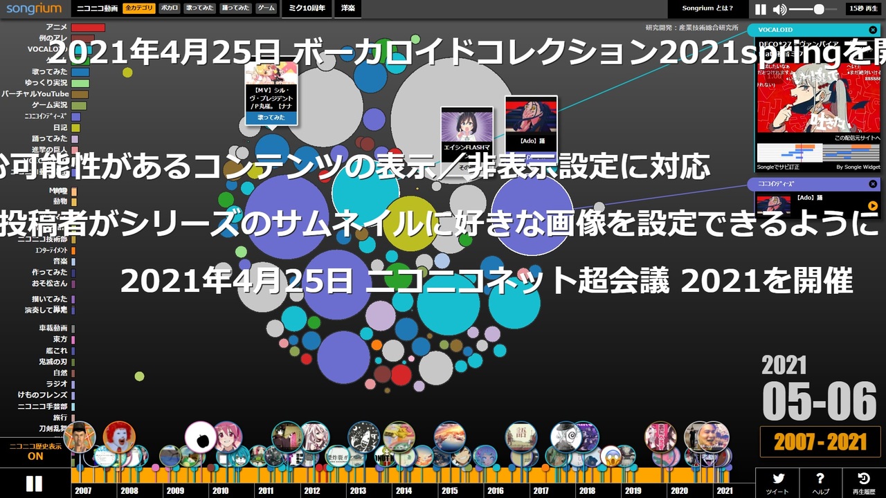 音楽視聴支援サービス Songrium の<strong>「Songrium超歴史プレーヤ ニコニコ動画15周年記念版」</strong>を紹介するデモンストレーション動画です。バブルアニメーション付きの連続再生とコメント風のイベント表示によって、2007年3月から2021年12月までのニコニコ動画15年の歴史を振り返ることができます。<br><br>Songrium超歴史プレーヤは以下のURLにて無料公開中です。パソコンでアクセスして、左側のカテゴリを押して絞り込んだり、下側の好きな年を押して拡大したりすれば、ここで再生されなかった動画も出現します。<br><strong><a href="https://bubble.songrium.jp/all?nn_history=1" target="_blank" rel="noopener nofollow">https://bubble.songrium.jp/all?nn_history=1</a></strong><br><br>Songrium は他にも様々な機能があります <strong><a href="https://songrium.jp" target="_blank" rel="noopener nofollow">https://songrium.jp</a></strong><br><br>2016年12月には<strong>「ニコニコ動画10年の歴史をまとめてみた - Songrium 超歴史プレーヤ」</strong>も公開しました。<br><strong><a href="https://www.nicovideo.jp/watch/sm30313860" target="_blank" rel="noopener nofollow">https://www.nicovideo.jp/watch/sm30313860</a></strong>