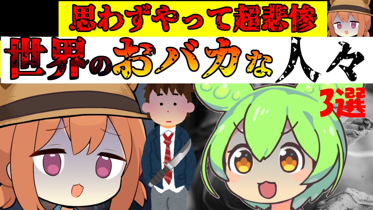 世界には思いがけない愚行つまり思わずおバカなことをした結果、悲惨な事件になった事例は数多く存在します。今回はこのように予期せぬを行いをした方に身に起きた恐ろしく珍しいおバカな事件・事故についてご紹介します<br><br>↓↓↓最新動画↓↓↓<br>変わり者末路:<a href="https://www.nicovideo.jp/watch/sm39932346" class="watch">sm39932346</a><br><br>【コメントのお返し】<br>この効果音好き かっぽこかっぽこ<br>⇨この音好きな人多いのよ。<br><br>リアル頭身出して♡<br>⇨好きな人いましたのよ。嫌いかと思って封印してましたが。うーんどうしようかな。<br><br>カナさん何のバイト?<br>⇨結構前の動画を見たらわかるのよ<br><br>ずんだもんもっとだして<br>⇨ずんだもんに乗っ取られるのよ<br><br>【広告くださった皆様へ】<br>投稿の励みになります。ありがとうございます。<br><br>【使用素材】<br>空想曲線 <a href="https://kopacurve.blog.fc2.com/" target="_blank" rel="noopener nofollow">https://kopacurve.blog.fc2.com/</a><br><br>【使用BGM・効果音】<br>◆DOVA-SYNDROME<br><a href="http://dova-s.jp/" target="_blank" rel="noopener nofollow">http://dova-s.jp/</a><br>◆MusMus<br><a href="https://musmus.main.jp/info.html" target="_blank" rel="noopener nofollow">https://musmus.main.jp/info.html</a><br>◆効果音ラボ<br><a href="https://soundeffect-lab.info/" target="_blank" rel="noopener nofollow">https://soundeffect-lab.info/</a><br>◆効果音:ポケットサウンド –<br>ボ色Ckcmg8yBpJk5I1fwu0sabJg<br>◆創作堂さくら紅葉<br><a href="https://yukizakura.net/" target="_blank" rel="noopener nofollow">https://yukizakura.net/</a>