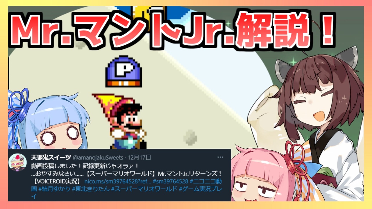 <span style="color: #e69138; font-size: 24px;">きりたん「贖罪から逃げるな。」</span><br><span style="color: #ff0000; font-size: 24px;">本家様の1キルチャートよりも簡単だと思います。皆さんも自分だけのMr.マントJr.を見つけよう!</span><br><br><span style="color: #0000ff;"><strong><流れの説明をば></strong></span><br><strong><a href="https://www.nicovideo.jp/watch/sm39555637" class="watch">sm39555637</a>(本家Mr.マントJr.最初の動画)<br>↓<br><a href="https://www.nicovideo.jp/watch/sm39745906" class="watch">sm39745906</a>(私の初挑戦)<br>↓<br>本家から更新したぞザマァツイート<br>↓<br><a href="https://www.nicovideo.jp/watch/sm39761522" class="watch">sm39761522</a>(私の記録更新動画)<br>↓<br><a href="https://www.nicovideo.jp/watch/sm39764528" class="watch">sm39764528</a>(本家からの更なる記録更新動画)<br>↓<br>イマココ</strong><br>(天邪鬼スイーツさんTwitterと映像の掲載許可ありがとござます!)<br><br>―――――――――――――――――――――――――――――――――――<br><span style="font-size: 14px;"> <br>次回からちゃんと贖罪します......。</span><br>この動画は「ボイチェビトーク1時間編集動画投稿祭」の参加動画です。<br>制作時間:2時間半いかないくらい。<br>日頃どれだけ、テンプレやexoファイルなどに助けられているか再認識する素敵な企画でした。<br>慣れない冒頭茶番が時間食いましたね。<br>企画説明→<a href="https://www.nicovideo.jp/watch/sm39707236" class="watch">sm39707236</a><br><br>―――――――――――――――――――――――――――――――――――<br>★ゲーム<br>『スーパーマリオワールド』ニンテンドースイッチ版<br>★使用立ち絵<br>からい様⇒【素材】東北きりたん立ち絵:<a href="https://seiga.nicovideo.jp/seiga/im7760810" target="_blank" rel="noopener">im7760810</a><br>かみち様⇒【SDピコピコ琴葉姉妹2】:<a href="https://seiga.nicovideo.jp/seiga/im6815058" target="_blank" rel="noopener">im6815058</a><br> 【SDピコピコ東北きりたんver1】:<a href="https://seiga.nicovideo.jp/seiga/im6346128" target="_blank" rel="noopener">im6346128</a><br>akihiyo様⇒【立ち琴葉茜・葵素材】:<a href="https://seiga.nicovideo.jp/seiga/im10569073" target="_blank" rel="noopener">im10569073</a><br>んゆ様⇒【琴葉姉妹 立ち絵素材】:<a href="https://seiga.nicovideo.jp/seiga/im8718850" target="_blank" rel="noopener">im8718850</a><br />★投稿者<br> twitter⇒<a href="https://twitter.com/high18595354" target="_blank" rel="noopener nofollow">https://twitter.com/high18595354</a><br>