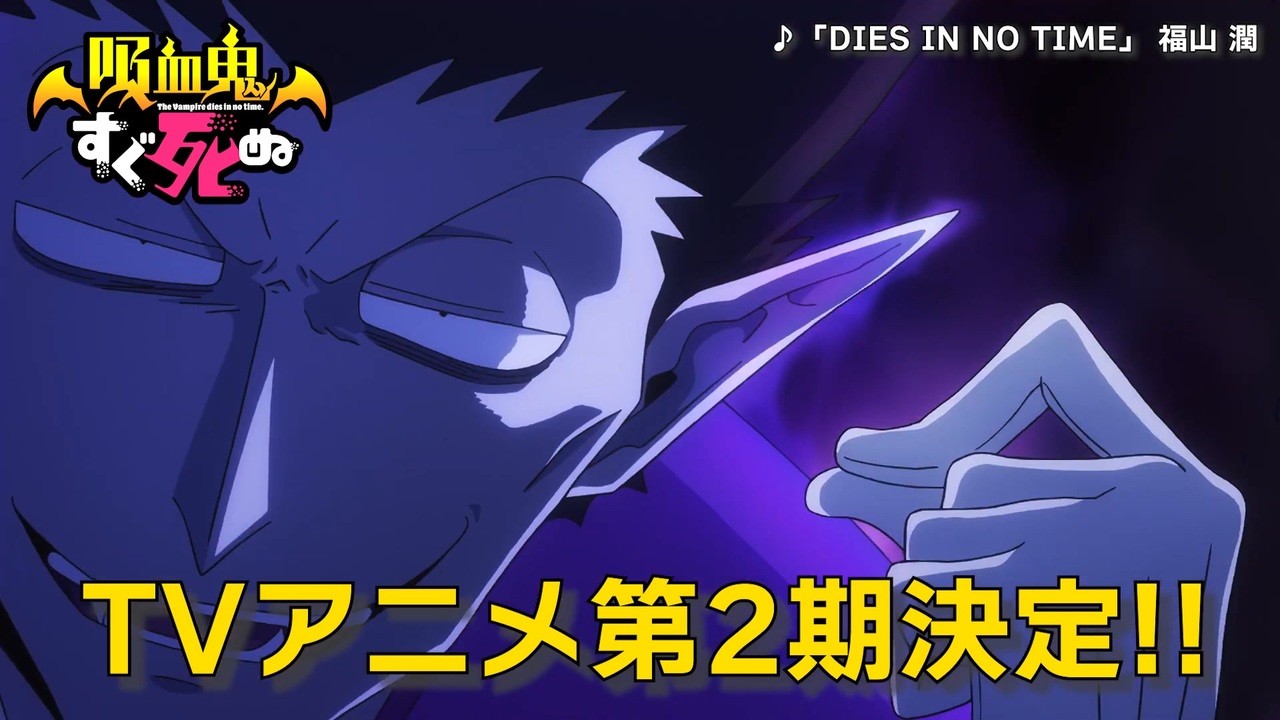 最弱吸血鬼と退治人コンビによるハイテンション即死ギャグ!!<br>TVアニメ「吸血鬼すぐ死ぬ」第2期決定!!<br><br>監督:神志那弘志<br>シリーズ構成・脚本:菅原雪絵<br>キャラクターデザイン・総作画監督:中野繭子<br>アニメーション制作:マッドハウス<br><br>続報をお待ちください‼‼<br><br>*****<br>Blu-ray&DVD発売!!<br><br>キャラクターデザイン・中野繭子描き下ろし特製三方背ケース&デジパック仕様のほか、トークCDやオーディコメンタリー、そして「ドラルクの砂」など、豪華特典が満載!!<br><br>vol.1 2022/1/26 発売<br>vol.2 2022/2/23 発売<br>vol.3 2022/3/23 発売<br><br>★詳しくは★<br><a href="https://sugushinu-anime.jp/bddvd/" target="_blank" rel="noopener nofollow">https://sugushinu-anime.jp/bddvd/</a><br><br>*****<br>◆TVアニメ「吸血鬼すぐ死ぬ」作品情報<br><br>【キャスト】 <br>ドラルク:福山 潤<br>ロナルド:古川 慎<br>ジョン:田村睦心<br>ヒナイチ:日岡なつみ<br>半田 桃:松岡禎丞<br>サテツ:細谷佳正<br>ショット:田丸篤志<br>フクマ:土岐隼一<br>ヒヨシ:小野大輔<br>カメ谷:近藤孝行<br>ほか<br><br>