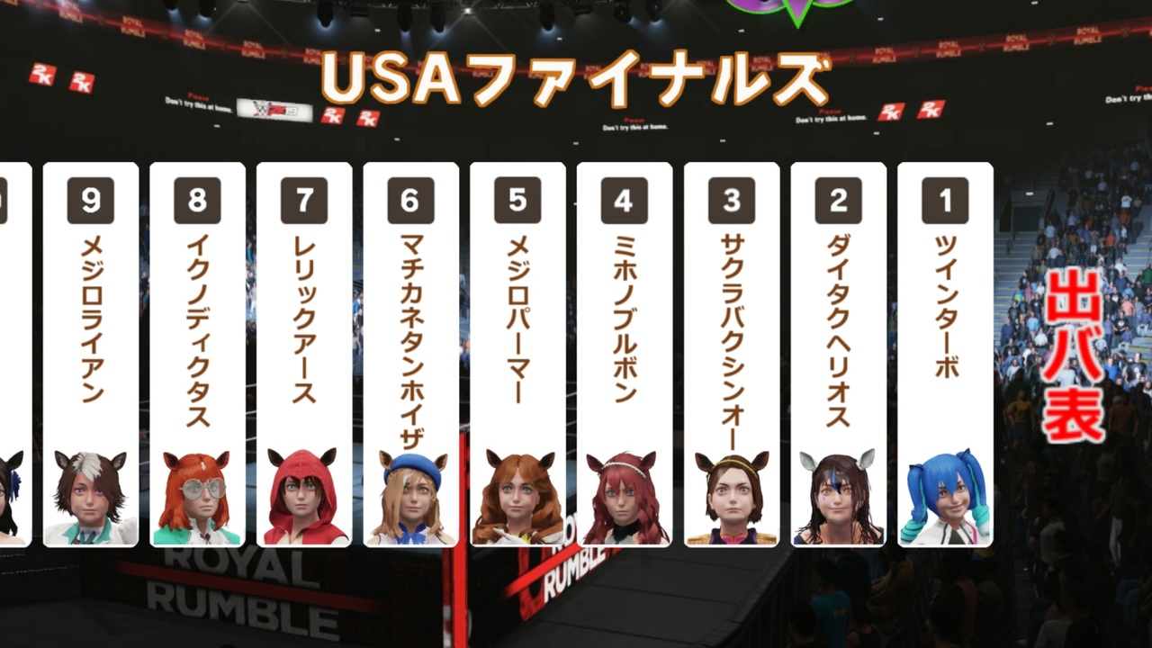 USAファイナルズ<a href="https://www.nicovideo.jp/watch/sm39762315" class="watch">sm39762315</a>の後編ランブル戦です<br>またクッソ長いので倍速なり適度に飛ばしてどうぞ<br>リングがいつもと違うのはゲームの仕様ですあしからず<br>外枠が圧倒的有利なこのプロレースを制するのは果たして誰だ!? <br><br>走れって?リングインの時に走ってるからセーフ<br><br>タマモ・平成三強→<a href="https://www.nicovideo.jp/watch/sm39980551" class="watch">sm39980551</a> <br><br>追記:広告ありがとうございます <br><br>ようつべ版<a href="https://youtu.be/qLQJunIJOzQ" target="_blank" rel="noopener nofollow">https://youtu.be/qLQJunIJOzQ</a><br>作った物まとめ<a href="https://www.nicovideo.jp/mylist/3948215" target="_blank" rel="noopener">mylist/3948215</a><br>