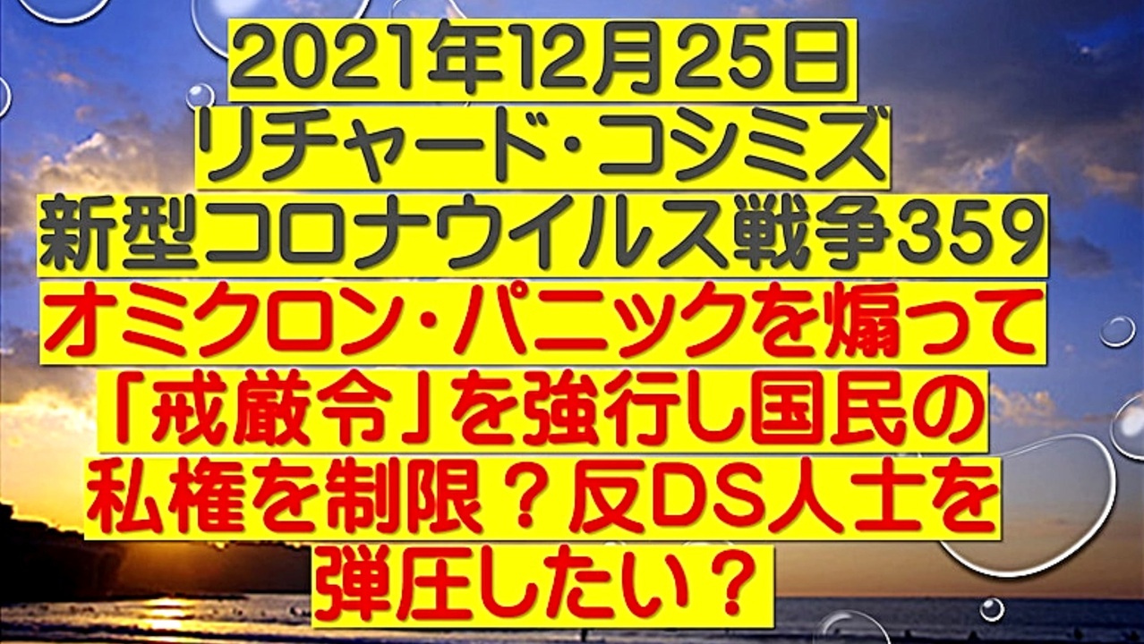 <span style="color: #cc4125;"><strong>「 テーマ:新型コロナウイルス戦争 359 」</strong></span><br><br><span style="color: #ff0000;"><strong>「 オミクロン・パニックを煽って『戒厳令』を強行し、国民の私権を制限?<br> 反DEEP STATE人士を弾圧したい? 」</strong></span><br><br> ◆オミクロン株テロ動向<br><br> ■感染力の強いオミクロン株を世界規模で流行させ、「戒厳令」同様の事態に追い込もうとしている。<br> 国民私権を制限して、反DEEP STATE人士を鎮圧する。<br><br> ■だが、発生国の南アフリカ共和国では、短期間でピークを過ぎ、既にほぼ収束している<br> (イベルメクチン効果なのか?)。<br><br> ■日本では「濃厚接触者」数を騒ぎ立て、深刻な事態だと煽るが、感染者数は大きくは増えていない。<br> 大流行はないのではないか?(イベルメクチン効果なのか?)<br><br> ◆ビル・ゲイツの奴隷たちは、「私権制限」・「強制接種」に持ち込もうとしているが、<br> 感染者が増えなければ、実現不可能である。<br><br> ◆イギリス1日の新規感染12万人超 オミクロン株影響か<br><br> ◆ニューヨーク州で新規感染4万4000人超 1週間で倍増 オミクロン株はすでに92%超え<br><br> ◆オミクロン株 濃厚接触者 全国で7819人<br><br><span style="color: #38761d;">◆</span><span style="color: #38761d;"><strong>リチャード・コシミズ 公式 ブログ</strong></span><br> <a href="https://ameblo.jp/richardneversurrender/" target="_blank" rel="noopener nofollow">https://ameblo.jp/richardneversurrender/</a><br><br><span style="color: #38761d;">◆</span><span style="color: #38761d;"><strong>リチャード・コシミズ 公式 ホームページ</strong></span><br> <a href="http://richardkoshimizu.boo.jp/" target="_blank" rel="noopener nofollow">http://richardkoshimizu.boo.jp/</a><br><br><span style="color: #38761d;">◆</span><span style="color: #38761d;"><strong>リチャード・コシミズ 講演会 公式 動画ギャラリー</strong></span><br> <a href="http://www.t-sskk.com/richardkoshimizu/video-gallery/index.html" target="_blank" rel="noopener nofollow">http://www.t-sskk.com/richardkoshimizu/video-gallery/index.html</a><br>