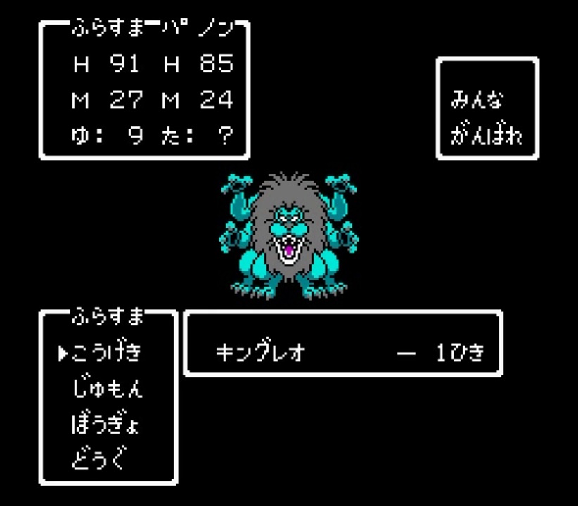 【TASさんの休日】FCドラクエ4 最少勝利回数&最低合計レベルクリア 5/7<br><br>5/7:第五章 キングレオ討伐まで<br>時間:30分46秒(累計:1時間38分33秒)<br>追記回数:4000回(累計:9240回)<br>ソフト:ファミコン版ドラゴンクエストⅣ 導かれし者たち<br><br>■Part5 第五章1<br>ミネア加入 4:45<br>マーニャ加入 5:20<br>9回目の勝利戦闘(@裏切りの洞窟_ベロベロ×2) 6:35<br>10回目の勝利戦闘(@裏切りの洞窟_吸血こうもり×2、裏切り小僧×2) 7:05<br>ホフマン加入 10:00<br>11回目の勝利戦闘(@大灯台_灯台タイガー、炎の戦士×2) 13:40<br>トルネコ加入 15:25<br>アリーナ、クリフト、ブライ加入 22:00<br>導かれし主戦力、伝説の旅芸人パノンが仲間に 23:20<br>12回目の勝利戦闘(@キングレオ_キングレオ) 28:55<br><br>-----------------------------------------------------<br>第1章<br><a href="https://www.nicovideo.jp/watch/sm39804759" class="watch">sm39804759</a><br><br>第2章<br><a href="https://www.nicovideo.jp/watch/sm39804948" class="watch">sm39804948</a><br><br>第3章<br><a href="https://www.nicovideo.jp/watch/sm39805000" class="watch">sm39805000</a><br><br>第4章<br><a href="https://www.nicovideo.jp/watch/sm39805064" class="watch">sm39805064</a><br><br>第5章パート1<br>今ご覧になっている動画です<br><br>第5章パート2<br><a href="https://www.nicovideo.jp/watch/sm39805173" class="watch">sm39805173</a><br><br>第3章パート3(最終回)<br><a href="https://www.nicovideo.jp/watch/sm39805271" class="watch">sm39805271</a><br><br>-----------------------------------------------------<br><br>この動画で利用している株式会社スクウェア・エニックスを代表とする共同著作者が権利を所有する著作物及びスギヤマ工房有限会社が権利を所有する楽曲の転載・配布は禁止いたします。<br>© 1990 ARMOR PROJECT/BIRD STUDIO/SPIKE CHUNSOFT/SQUARE ENIX All Rights Reserved.<br>© SUGIYAMA KOBO<br><br>当動画はユーチューブでも上げています<br><a href="https://youtu.be/jw7Z5SUuLGo" target="_blank" rel="noopener nofollow">https://youtu.be/jw7Z5SUuLGo</a>