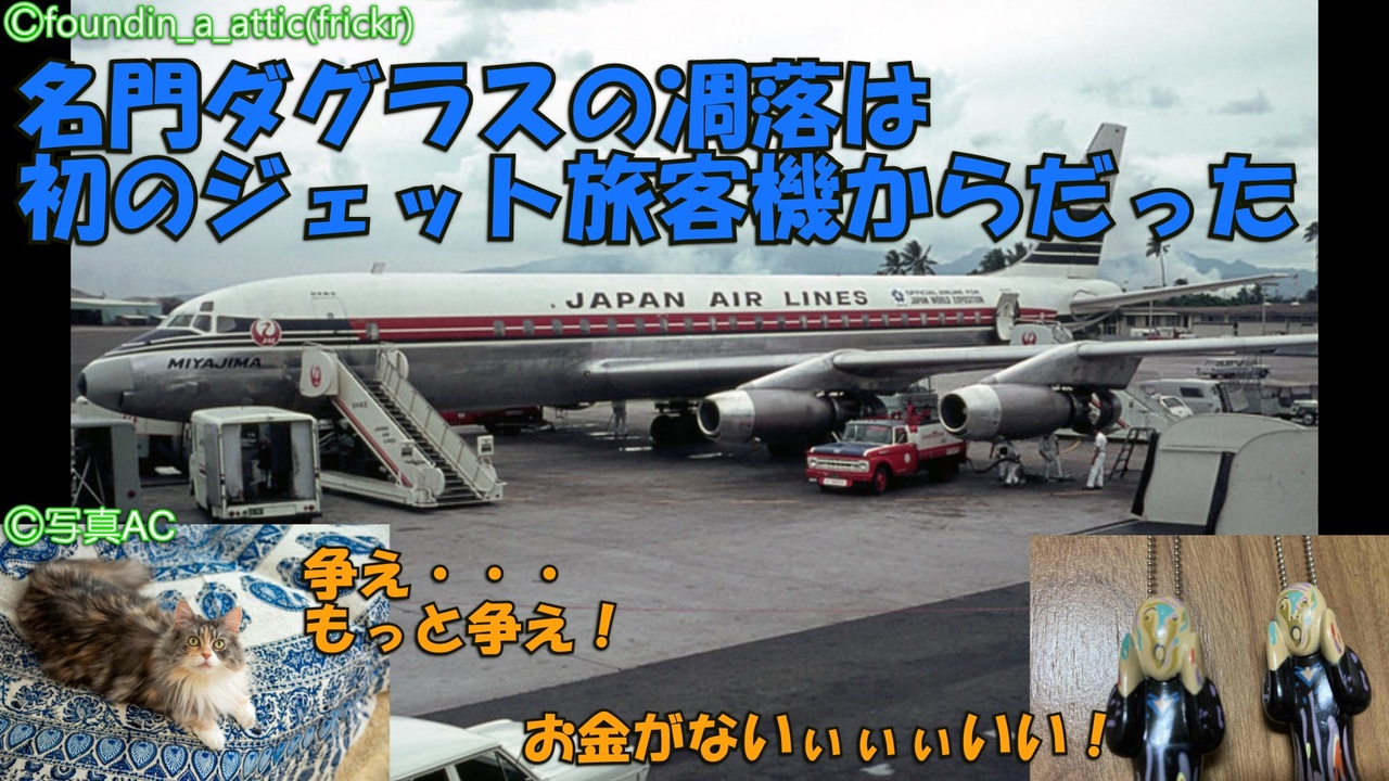 今回から久しぶりに長期シリーズをやります。<br>今回のテーマはレシプロ機時代の絶対的王者であり、ジェット時代初期はボーイングと並ぶ世界の二大航空機メーカーだった「マクドネル・ダグラス」が、なぜボーイングやエアバスとの競争に敗れ、消えていったのかを解説していきます。<br>第一章で取り上げるのはダグラス初のジェット旅客機・DC-8。DC-8自体はボーイング707と互角の争いを演じた名機ですが、その裏ではよく言えば保守的、悪く言えば優柔不断でリスクを恐れるダグラスの体質や資金難と言った、ダグラス消滅の兆候が見え隠れしていました。詳しくは本編で。<br><br>第二章前編→<a href="https://www.nicovideo.jp/watch/sm39836583" class="watch">sm39836583</a><br /><span style="color: #000000; font-size: 14px;">迷航空会社列伝</span><span style="color: #006699; font-size: 14px;"><a href="https://www.nicovideo.jp/mylist/24098760" target="_blank" rel="noopener">mylist/24098760</a></span><span style="color: #000000; font-size: 14px;"> 迷列車北陸編</span><span style="color: #006699; font-size: 14px;"><a href="https://www.nicovideo.jp/mylist/19084652" target="_blank" rel="noopener">mylist/19084652</a> </span><span style="color: #000000; font-size: 14px;">東海道交通戦争</span><span style="color: #006699; font-size: 14px;"><a href="https://www.nicovideo.jp/mylist/57958388" target="_blank" rel="noopener">mylist/57958388</a></span><span style="color: #000000; font-size: 14px;"> 交通機関の栄枯盛衰 </span><a href="https://www.nicovideo.jp/mylist/66898301" target="_blank" rel="noopener">mylist/66898301</a><br><span style="color: #000000; font-size: 14px;">ブログ→</span><span style="color: #006699; font-size: 14px;"><a href="http://www.meihokuriku-alps.com" target="_blank" rel="noopener nofollow">http://www.meihokuriku-alps.com</a></span><br>note→<a href="https://note.com/meihokuriku" target="_blank" rel="noopener nofollow">https://note.com/meihokuriku</a><br><span style="color: #000000; font-size: 14px;">使用BGM<br>甘茶の音楽工房様 </span><span style="color: #006699; font-size: 14px;"><a href="http://amachamusic.chagasi.com/index.html" target="_blank" rel="noopener nofollow">http://amachamusic.chagasi.com/index.html</a></span><br><span style="color: #000000; font-size: 14px;">魔王魂様 </span><span style="color: #006699; font-size: 14px;"><a href="https://maoudamashii.jokersounds.com/list/bgm5.html" target="_blank" rel="noopener nofollow">https://maoudamashii.jokersounds.com/list/bgm5.html</a></span>