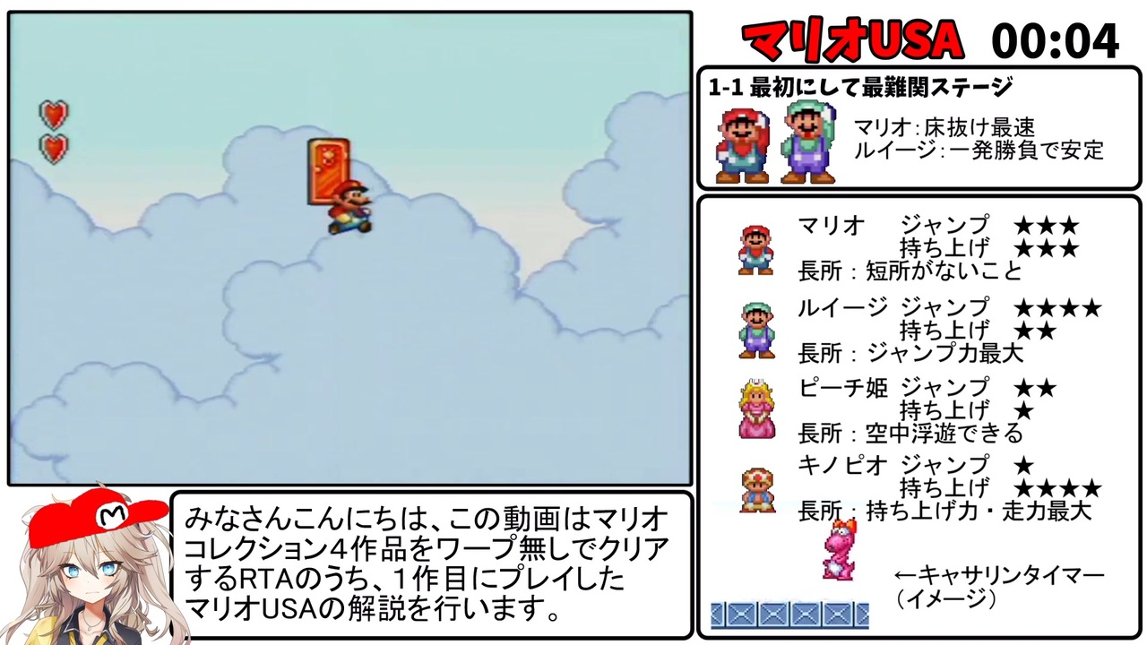 マリオコレクション全作ワープ無しRTAのうち、1作目のスーパーマリオUSAのゆっくり解説をします。<br><br>Part2 マリオ2(<a href="https://www.nicovideo.jp/watch/sm39880347" class="watch">sm39880347</a>)<br>Part3 マリオ1(<a href="https://www.nicovideo.jp/watch/sm39907765" class="watch">sm39907765</a>)<br>Part4 マリオ3前編(<a href="https://www.nicovideo.jp/watch/sm39968248" class="watch">sm39968248</a>)<br>Part5 マリオ3後半(<a href="https://www.nicovideo.jp/watch/sm40053887" class="watch">sm40053887</a>)<br>シリーズマイリスト(<a href="https://www.nicovideo.jp/mylist/72452758" target="_blank" rel="noopener">mylist/72452758</a>)<br><br>解説なし全作通し動画(<a href="https://www.nicovideo.jp/watch/sm39755033" class="watch">sm39755033</a>)<br>Youtube版→(<a href="https://youtu.be/sUEDjowG45A)" target="_blank" rel="noopener nofollow">https://youtu.be/sUEDjowG45A)</a><br><br>使用させて頂いたソフト・素材<br>・動画編集<br> ・ゆっくりMovieMaker4β(<a href="https://manjubox.net/ymm4/" target="_blank" rel="noopener nofollow">https://manjubox.net/ymm4/</a> )<br> ・AviUtl(<a href="http://spring-fragrance.mints.ne.jp/aviutl/" target="_blank" rel="noopener nofollow">http://spring-fragrance.mints.ne.jp/aviutl/</a> )<br>・音声素材<br> ・VOICEVOX_春日部つむぎ(<a href="https://voicevox.hiroshiba.jp/" target="_blank" rel="noopener nofollow">https://voicevox.hiroshiba.jp/</a> )<br> ・春日部つむぎ公式立ち絵素材(<a href="https://kasukabe294.booth.pm/items/3474402" target="_blank" rel="noopener nofollow">https://kasukabe294.booth.pm/items/3474402</a> )<br><br>