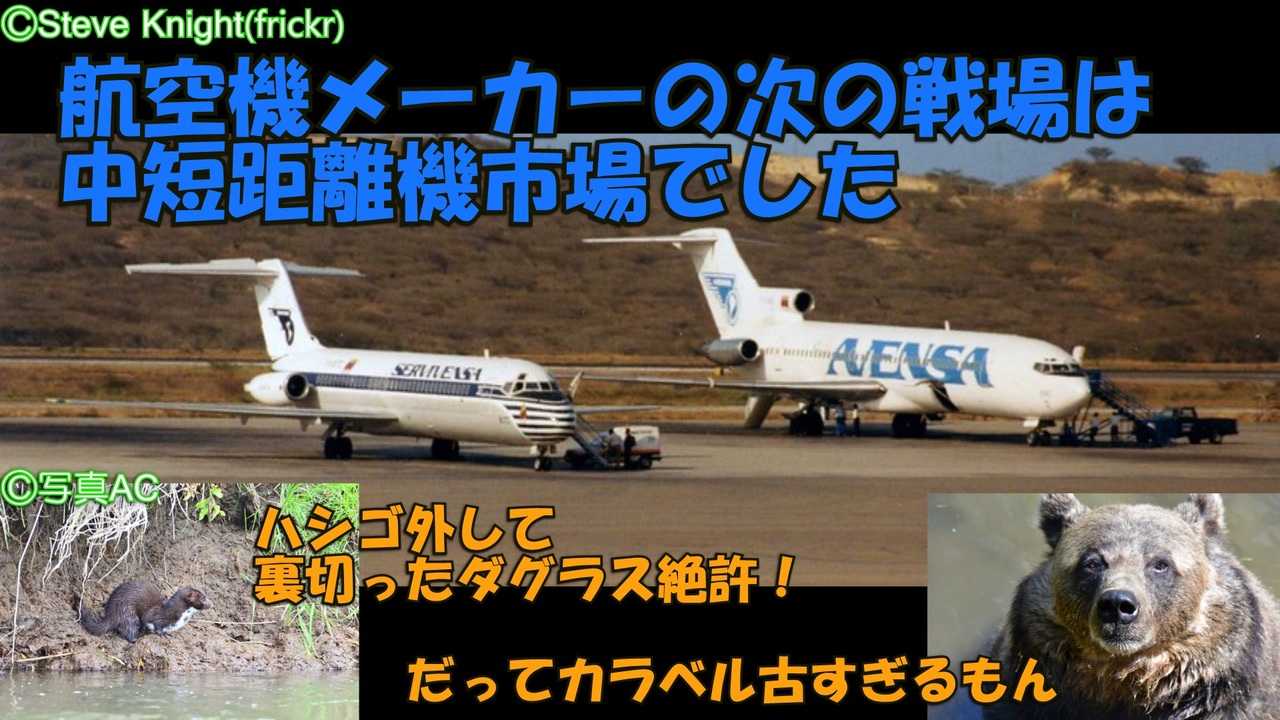 ※この動画はシリーズ物です。まだ第一章をご覧になっていない方はこちらをどうぞ→<a href="https://www.nicovideo.jp/watch/sm39816964" class="watch">sm39816964</a><br><br>ダグラスとボーイングが次に狙ったのは欧州の航空機メーカーが先行していた中短距離の小型ジェット機市場。ボーイングは主要都市間用の727を、ダグラスは中小航空会社向けのDC-9を開発します。<br>727は大ヒット機となってボーイングの経営改善に貢献し、DC-9も当初は迷走したものの、シンプルな設計と効率の良さでこちらも大きなヒット作となります。しかし、この成功が後にダグラスを窮地に追い込む事になるとは、ダグラス自身も気づきませんでした。詳しくは本編で。<br><br>そしてこれが年内最後の投稿です。皆様どうぞ良いお年を。<br><br>後編できました→<a href="https://www.nicovideo.jp/watch/sm39873800" class="watch">sm39873800</a><br><br /><span style="color: #000000; font-size: 14px;">迷航空会社列伝</span><span style="color: #006699; font-size: 14px;"><a href="https://www.nicovideo.jp/mylist/24098760" target="_blank" rel="noopener">mylist/24098760</a></span><span style="color: #000000; font-size: 14px;"> 迷列車北陸編</span><span style="color: #006699; font-size: 14px;"><a href="https://www.nicovideo.jp/mylist/19084652" target="_blank" rel="noopener">mylist/19084652</a> </span><span style="color: #000000; font-size: 14px;">東海道交通戦争</span><span style="color: #006699; font-size: 14px;"><a href="https://www.nicovideo.jp/mylist/57958388" target="_blank" rel="noopener">mylist/57958388</a></span><span style="color: #000000; font-size: 14px;"> 交通機関の栄枯盛衰 </span><a href="https://www.nicovideo.jp/mylist/66898301" target="_blank" rel="noopener">mylist/66898301</a><br><span style="color: #000000; font-size: 14px;">ブログ→</span><span style="color: #006699; font-size: 14px;"><a href="http://www.meihokuriku-alps.com" target="_blank" rel="noopener nofollow">http://www.meihokuriku-alps.com</a></span><br>note→<a href="https://note.com/meihokuriku" target="_blank" rel="noopener nofollow">https://note.com/meihokuriku</a><br><span style="color: #000000; font-size: 14px;">使用BGM<br>甘茶の音楽工房様 </span><span style="color: #006699; font-size: 14px;"><a href="http://amachamusic.chagasi.com/index.html" target="_blank" rel="noopener nofollow">http://amachamusic.chagasi.com/index.html</a></span><br><span style="color: #000000; font-size: 14px;">魔王魂様 </span><span style="color: #006699; font-size: 14px;"><a href="https://maoudamashii.jokersounds.com/list/bgm5.html" target="_blank" rel="noopener nofollow">https://maoudamashii.jokersounds.com/list/bgm5.html</a></span>