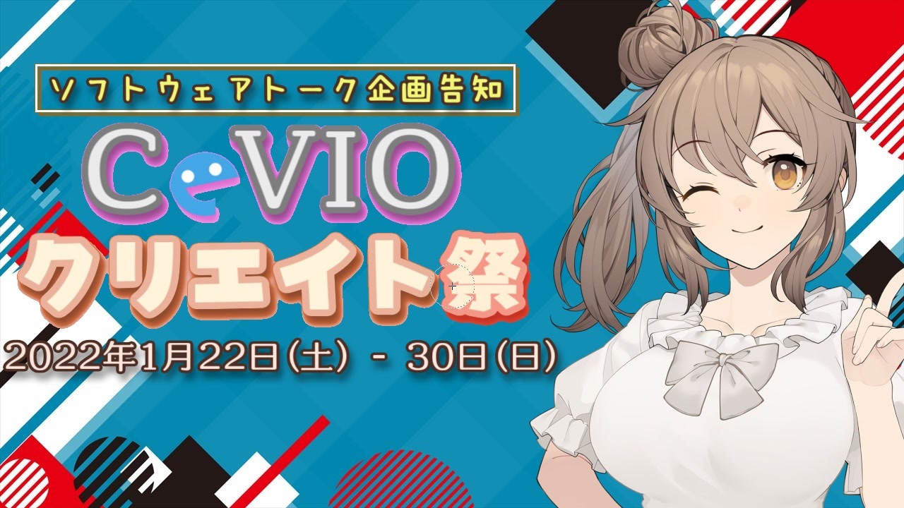 <span style="font-size: 16px;">毎年1月、CeVIOの創作してみませんか?</span><br><br>2022年からCeVIOクリエイト祭を開催します!!<br><br>[参加のレギュレーション]<br>・CeVIO, CeVIO AIの合成音声ソフト・ボイス素材、またはそれらのキャラクターを<br> 題材とした作品(動画、静画、小説)<br>・テーマは自由 (ただし、CeVIOや各キャラクターの公式規約に従ったもの)<br>・オリジナルのキャラクターにCeVIO, CeVIO AIの合成音声ソフトを使用した場合も参加可能<br>・第1回CeVIOクリエイト祭 のタグを付ける(ロックが可能な投稿サイトはロックしてください)<br> Twitterは、#第1回CeVIOクリエイト祭 のハッシュタグを付けます。<br><br>[開催期間] 2022/1/22(土) - 1/30(日)<br><br>[主催 兼 問い合わせ先] テステス<br><a href="https://twitter.com/tsts4767" target="_blank" rel="noopener nofollow">https://twitter.com/tsts4767</a><br><br>イベントの運営・告知ツイッター <a href="https://twitter.com/CeVIO_CreateFes" target="_blank" rel="noopener nofollow">https://twitter.com/CeVIO_CreateFes</a><br><br>第1回CeVIOクリエイト祭 <a href="https://www.nicovideo.jp/mylist/72395500" target="_blank" rel="noopener">mylist/72395500</a><br>イラストクリップ <a href="https://seiga.nicovideo.jp/clip/3319063" target="_blank" rel="noopener">clip/3319063</a><br>Pixiv<br><a href="https://www.pixiv.net/users/25805567/bookmarks/artworks/%E7%AC%AC1%E5%9B%9ECeVIO%E3%82%AF%E3%83%AA%E3%82%A8%E3%82%A4%E3%83%88%E7%A5%AD" target="_blank" rel="noopener nofollow">https://www.pixiv.net/users/25805567/bookmarks/artworks/%E7%AC%AC1%E5%9B%9ECeVIO%E3%82%AF%E3%83%AA%E3%82%A8%E3%82%A4%E3%83%88%E7%A5%AD</a><br><br>Togetter <a href="https://togetter.com/li/1824420" target="_blank" rel="noopener nofollow">https://togetter.com/li/1824420</a><br><br>Color Voice Seriesの販売先URL<br><a href="https://pcshop.vector.co.jp/service/catalogue/cevio_cvs/" target="_blank" rel="noopener nofollow">https://pcshop.vector.co.jp/service/catalogue/cevio_cvs/</a><br><br>CeVIOクリエイト祭のロゴ 2022/11/2 URL更新<br><a href="https://drive.google.com/drive/folders/1MDsKEFL-rLvBtcuabWUGzUyek-SbwTWK?usp=sharing" target="_blank" rel="noopener nofollow">https://drive.google.com/drive/folders/1MDsKEFL-rLvBtcuabWUGzUyek-SbwTWK?usp=sharing</a><br><br>動画内の質問コメントについては、大百科の「CeVIOクリエイト祭」の記事にてご回答致しました。<br><br>(2022/1/31)この動画をご広告して下さった方々のお名前は、<br>以下の閉会式の記事に移行させて頂きました。<br><a href="https://tsts4767.hatenablog.com/entry/2022/01/31/230405" target="_blank" rel="noopener nofollow">https://tsts4767.hatenablog.com/entry/2022/01/31/230405</a>