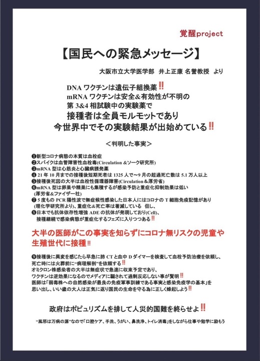 発信元<br><br><a href="https://twitter.com/plusone0824/status/1476036952868929537?s=21" target="_blank" rel="noopener nofollow">https://twitter.com/plusone0824/status/1476036952868929537?s=21</a><br><br><br>国民への緊急メッセージ。<br><br>大阪市立大学医学部井上正康名誉教授より。<br><br>DNAワクチンは遺伝子組換薬!!<br>mRNAワクチンは安全&有効性が不明の<br>第3&4相試験中の実験薬で<br>接種者は全員モルモットであり<br>今世界中でその実験結果が出始めている!!<br><br>く判明した事実><br>①新型コロナ病態の本質は血栓症。<br>②スパイクは血管障害性血栓毒( Circulation&ソーク研究所)。<br>③mRNA型は心筋炎と心臟病誘発薬。<br>④21年10月までの接種後短期死者は1325人で~9月の超過死亡数は5.1万人以上。<br>⑤接種後死因の大半は血栓性循環器障害( Circulation&厚労省)。<br>⑥mRNA型は卵巣や精巣にも集積するが感染予防と重症化抑制効果は低い。<br>(厚労省&ファイザー社)<br>⑦5度ものPCR陽性波で無症候性感染した日本人にはコロナのT細胞免疫記憶があり。<br>(理化学研究所より、重症化&死亡率は著減している。<br>⑧日本でも抗体依存性増強ADEの抗体が発現しており<br>接種継続で感染病態が重症化するフェズに入りつつある。<br><br>大半の医師がこの事実を知らずにコロナ無リスクの児童や生殖世代に接種。<br><br>⑨接種後に異変を感じたら早急に肺CTと血中Dダイマーを検査して血栓予防治療を依頼し、<br>死亡時には火葬前に病理解剖を依頼する。<br>オミクロン株感染者の大半は無症状で急速に収束予定であり、<br>ワクチンは逆効果になるのでメディアにだまされて過剰反応しない事が賢明。<br>医師は「弱毒株への自然感染が最良の免疫軍事訓練である事実と感染免疫学の基本」を<br>思い出し、いい歳の大人は正気に返り国民の生命を守る為に正しくほうきしよう。<br><br>政府はポピュリズムを排して人災的国難を終らせよ!<br><br>風邪は万病の源、なので「ロ腔ケア、手洗い、うがい、鼻洗浄、トイレ消毒」をしながら仕事や勉学に励もう。