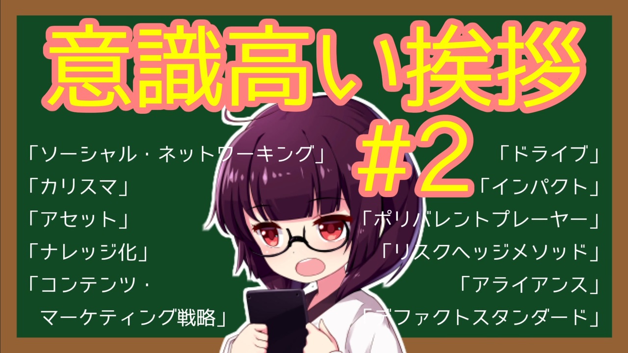 <span style="color: #ff9900;"><strong>いいね!にこの動画のpart1に皆さんにコメントで書いていただいた平均正解率を書いています</strong></span><br><br>第一章の紹介動画はこちらです<br><a href="https://www.nicovideo.jp/watch/sm38553014" target="_blank" rel="noopener nofollow">https://www.nicovideo.jp/watch/sm38553014</a><br><br>今回ご紹介した挨拶<br>株式会社LIGの第8期社長、岩上貴洋さんの挨拶文の一部です<br><a href="https://liginc.co.jp/company/message/the2014" target="_blank" rel="noopener nofollow">https://liginc.co.jp/company/message/the2014</a><br>***<br><span style="font-size: 10px;">◆立ち絵<br>blueberry さん / 京町セイカ【キャラ素材】<br>blueberry さん / 東北きりたん【キャラ素材】<br>MtU さん / 東北ずん子さん立ち絵素材ver2.0<br>◆BGM<br>MATSU さん / Shall we meet?<br>◆画像<br>野田工房アニソンカラオケ制作室 さん / 【素材】黒板<br>◆効果音<br>効果音ラボ さん / 決定、ボタン押下22 / 決定、ボタン押下26</span><br />***<span style="font-size: 10px;">共通メッセージ 最終更新2024/12/31</span><br><span style="color: #ff9900;"><strong>★今後の投稿予定のご案内(変更の可能性があります)</strong></span><br>定期的に投稿する予定ですので、よろしければフォローよろしくお願いします<br><br><span style="font-size: 10px;">現在のストック一覧</span><br><span style="font-size: 10px;"><u>メインシリーズ(7) 3か月に1本ずつ公開予定です</u></span><br><span style="font-size: 10px;">・サービス残業をする理由解説<br>・会社辞める人あるある<br>・短所を長所に置き換え リフレーミング解説<br>・クソ会議あるある<br>・職場の働き方改革あるある<br>・職場の喫煙事情あるある<br>・職場のeラーニングあるある</span>