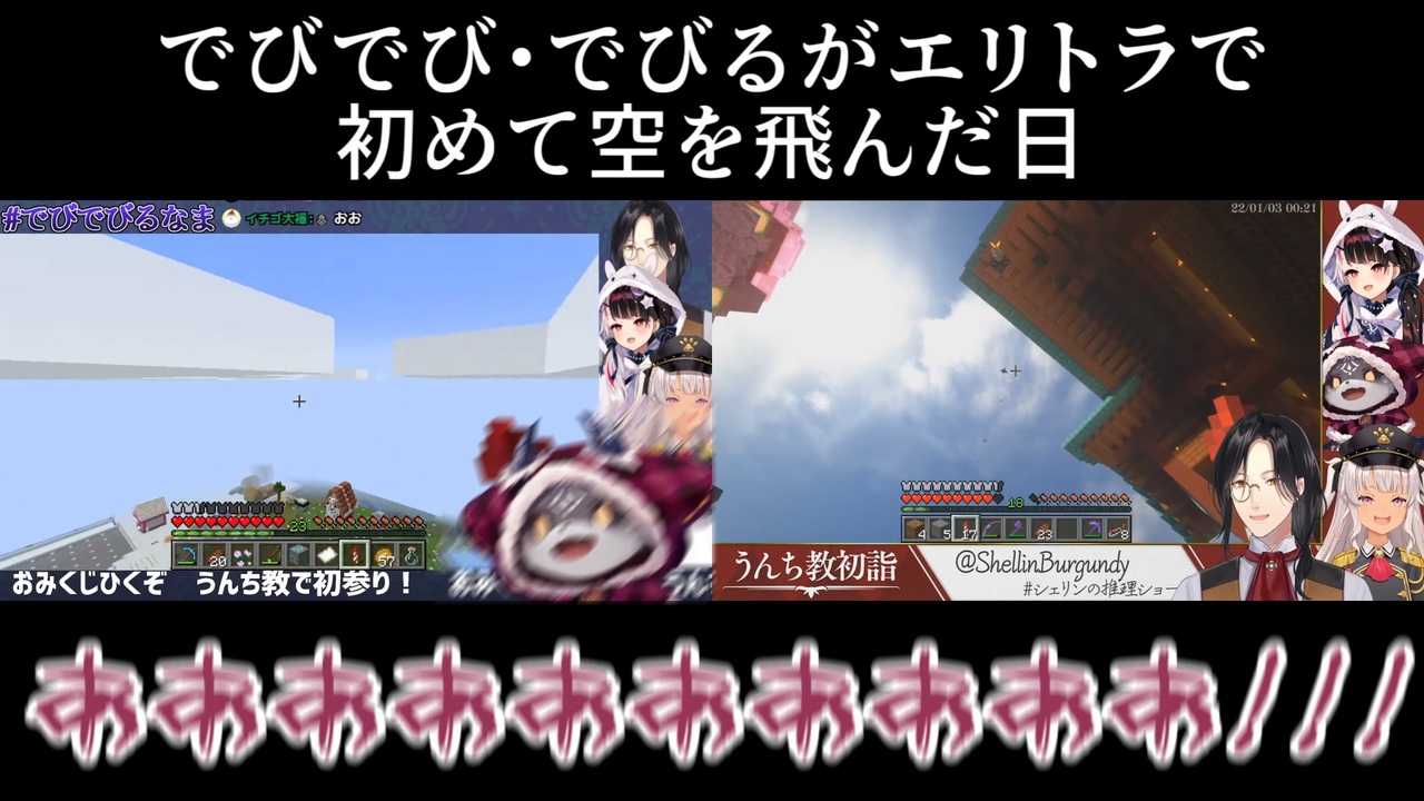 唯一翼持ってるでびちゃんだけが飛べないという圧倒的矛盾<br><br>本家参考動画<br>・でびでび・でびる<br>【マイクラ】新年うんち参り【夜見れな/魔使マオ/シェリン・バーガンディ/でびでび・でびる/にじさんじ】<br><a href="https://youtu.be/Itcvk3op_Yo" target="_blank" rel="noopener nofollow">https://youtu.be/Itcvk3op_Yo</a><br>・シェリン・バーガンディ<br>【マイクラ】うんち教初詣【シェリン/にじさんじ】<br><a href="https://youtu.be/Vvg_y3zPDoo" target="_blank" rel="noopener nofollow">https://youtu.be/Vvg_y3zPDoo</a><br><br>参考元チャンネル&Twitter<br>・でびでび・でびる<br><a href="https://www.youtube.com/channel/UCjlmCrq4TP1I4xguOtJ-31w" target="_blank" rel="noopener nofollow">https://www.youtube.com/channel/UCjlmCrq4TP1I4xguOtJ-31w</a><br><a href="https://twitter.com/debidebiru_sama" target="_blank" rel="noopener nofollow">https://twitter.com/debidebiru_sama</a><br>・シェリン・バーガンディ<br><a href="https://www.youtube.com/channel/UCHBhnG2G-qN0JrrWmMO2FTA" target="_blank" rel="noopener nofollow">https://www.youtube.com/channel/UCHBhnG2G-qN0JrrWmMO2FTA</a><br><a href="https://twitter.com/ShellinBurgundy" target="_blank" rel="noopener nofollow">https://twitter.com/ShellinBurgundy</a><br>・魔使マオ<br><a href="https://www.youtube.com/channel/UCerkculBD7YLc_vOGrF7tKg" target="_blank" rel="noopener nofollow">https://www.youtube.com/channel/UCerkculBD7YLc_vOGrF7tKg</a><br><a href="https://twitter.com/matsukai_mao" target="_blank" rel="noopener nofollow">https://twitter.com/matsukai_mao</a><br>・夜見れな<br><a href="https://www.youtube.com/channel/UCL34fAoFim9oHLbVzMKFavQ" target="_blank" rel="noopener nofollow">https://www.youtube.com/channel/UCL34fAoFim9oHLbVzMKFavQ</a><br><a href="https://twitter.com/rena_yorumi" target="_blank" rel="noopener nofollow">https://twitter.com/rena_yorumi</a><br><br>ニコニコのダイコンマンリスト<br>「バーチャルYouTuberシリーズ」↓<br><a href="https://www.nicovideo.jp/mylist/62551838" target="_blank" rel="noopener">mylist/62551838</a><br>「バーチャルYouTuberシリーズ2」↓<br><a href="https://www.nicovideo.jp/mylist/67858437" target="_blank" rel="noopener">mylist/67858437</a><br>「バーチャルYouTuberシリーズ3」↓<br><a href="https://www.nicovideo.jp/mylist/71340675" target="_blank" rel="noopener">mylist/71340675</a><br><br>ダイコンマンのTwitter<br><a href="https://twitter.com/Daikon_Man_V" target="_blank" rel="noopener nofollow">https://twitter.com/Daikon_Man_V</a>