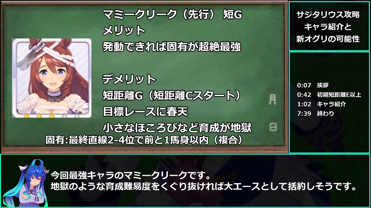 ブルボンそういや春天あるの忘れとったサーセン<br><br>対人戦基礎知識<br>初級編→<a href="https://www.nicovideo.jp/watch/sm39432258" class="watch">sm39432258</a><br>中級編→<a href="https://www.nicovideo.jp/watch/sm39432514" class="watch">sm39432514</a><br>スキル編→<a href="https://www.nicovideo.jp/watch/sm39433182" class="watch">sm39433182</a><br>スキルランキング編→<a href="https://www.nicovideo.jp/watch/sm39407156" class="watch">sm39407156</a><br>加速について→<a href="https://www.nicovideo.jp/watch/sm39583007" class="watch">sm39583007</a><br>コース別加速スキルランキング→<a href="https://www.nicovideo.jp/watch/sm39774678" class="watch">sm39774678</a><br><br>ツイッターも始めたのでよろしくなす<br><a href="https://twitter.com/umamusumetama" target="_blank" rel="noopener nofollow">https://twitter.com/umamusumetama</a><br><br>↓にあるシリーズから過去動画みれるぞ。<br>もうマイリスの時代じゃないんだ。悔しいけど仕方ないんだ。<br>