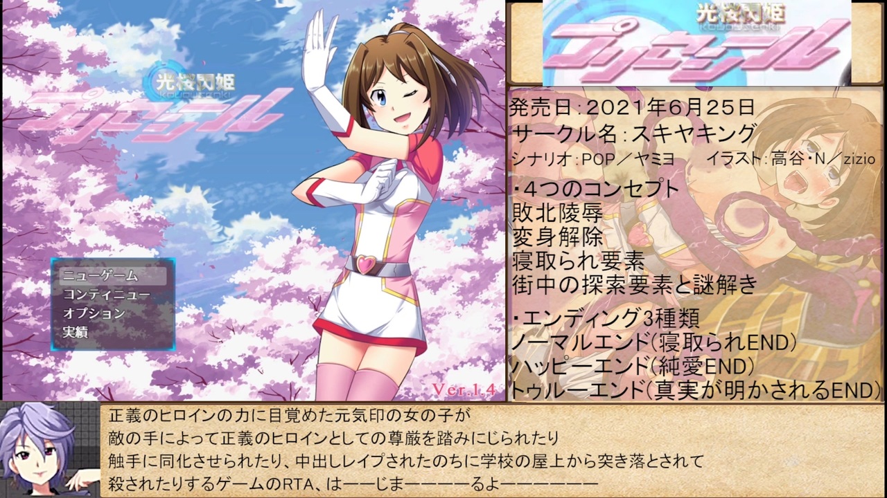 3時間以上のRTAを走るのは初めてなので初投稿です!!!<br><br>長時間になりますが、どうぞお付き合いくださいませ・・・<br><br>個人的英語版ガルパンハマリ役<br><br>1位 同志 カチューシャ<br>2位 ドゥーチェ アンチョビ<br>3位 大洗の首狩り兎リーダー 澤ちゃん<br><br>追記<br>✕東海レン<br>○海東レン<br><br>【スキヤキング】様制作<br>「光桜閃姫プリセシール」ラスボス撃破までのRTAを走らせて頂きました。<br><br><span style="font-size: 24px;"><a href="https://www.dlsite.com/maniax/work/=/product_id/RJ303498.html" target="_blank" rel="noopener nofollow">https://www.dlsite.com/maniax/work/=/product_id/RJ303498.html</a></span><br><br>■あらすじ■<br>202X年<br>神喰市は驚異にさらされていた。<br>街中に突如出現する魔高炉。<br>そこから出現する魔精獣と呼ばれる異形の怪物。<br><br>街に平和を取り戻すため、姫宮サクラは光桜閃姫プリセシールとなり奮闘するのであった。<br><br>しかし...<br><br>魔精獣を束ねる魔将の出現。<br>謎の団体、創神教の暗躍。<br><br>サクラとあなたは次々に襲い来る魔精獣や魔将に勝利しながらも<br>神喰市に広がる陰謀や謎を解明できるのか?<br><br>ラストに待ち受けている衝撃の結末をその目で確かめよう。<br><br><br>美少女シスター陵辱RTAマイリスト→<a href="https://www.nicovideo.jp/mylist/71433234" target="_blank" rel="noopener">mylist/71433234</a><br>ドスケベくノ一陵辱RTAマイリスト→<a href="https://www.nicovideo.jp/mylist/71433237" target="_blank" rel="noopener">mylist/71433237</a><br>美少女エスパー陵辱RTAマイリスト→<a href="https://www.nicovideo.jp/mylist/71453605" target="_blank" rel="noopener">mylist/71453605</a><br>正義の魔法少女陵辱RTAマイリスト→<a href="https://www.nicovideo.jp/mylist/72027465" target="_blank" rel="noopener">mylist/72027465</a><br>ムチムチな天使陵辱RTAマイリスト→<a href="https://www.nicovideo.jp/mylist/72196860" target="_blank" rel="noopener">mylist/72196860</a><br>正義のヒロイン陵辱RTAマイリスト→<a href="https://www.nicovideo.jp/mylist/72424512" target="_blank" rel="noopener">mylist/72424512</a>