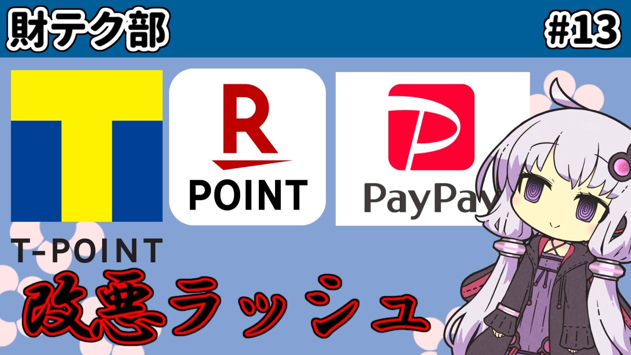 2022年は4月から様々なポイントサービスの改悪ラッシュがあります。<br>昨年末に立て続けで発表されたので、ここで一旦、おさらいをしておきましょう。<br><br>また、以前、p-one wizカードをお勧めする旨の動画を出しました。<br>当該クレカを利用することで溜まるポイントの交換先であるTポイントの使い勝手が悪くなる可能性がありますので、注意してください。<br><br>★ハピタス:<a href="https://hapitas.jp/register?i=20152054&route=pcText" target="_blank" rel="noopener nofollow">https://hapitas.jp/register?i=20152054&route=pcText</a><br><br /><br>steamフレコ →【1055264379】<br><br>YouTube →<a href="http://www.youtube.com/channel/UCUixKgT8mpWi1kkpIojrgtw?sub_confirmation=1" target="_blank" rel="noopener nofollow">http://www.youtube.com/channel/UCUixKgT8mpWi1kkpIojrgtw?sub_confirmation=1</a><br><br>その他にこういう動画を投稿しているよ<br>マイリスト<br>[<a href="https://www.nicovideo.jp/mylist/69793773" target="_blank" rel="noopener">mylist/69793773</a>]:「投稿した動画全部」<br><br>継続中!<br>[<a href="https://www.nicovideo.jp/series/21662" target="_blank" rel="noopener">series/21662</a>]:「茜ちゃん達とパズルにチャレンジ」<br>[<a href="https://www.nicovideo.jp/series/187884" target="_blank" rel="noopener">series/187884</a>]:「財テク部活動記録」<br>[<a href="https://www.nicovideo.jp/series/192825" target="_blank" rel="noopener">series/192825</a>]:「我が友に鼻血が出るほど難しいパズルゲーをやらせたい」<br>[<a href="https://www.nicovideo.jp/series/150989" target="_blank" rel="noopener">series/150989</a>]:「FX文学」<br>[<a href="https://www.nicovideo.jp/series/125537" target="_blank" rel="noopener">series/125537</a>]:「VOICEROID劇場」<br><br>たまに更新するかも!<br>[<a href="https://www.nicovideo.jp/series/83799" target="_blank" rel="noopener">series/83799</a>]:「プレインズウォーカー茜ちゃん」<br><br>完結済み!<br>[<a href="https://www.nicovideo.jp/series/159553" target="_blank" rel="noopener">series/159553</a>]:「Voiceroid劇場×Short×Short」<br>[<a href="https://www.nicovideo.jp/series/83794" target="_blank" rel="noopener">series/83794</a>]:「琴葉家の食卓」(財テク部活動記録の前身)