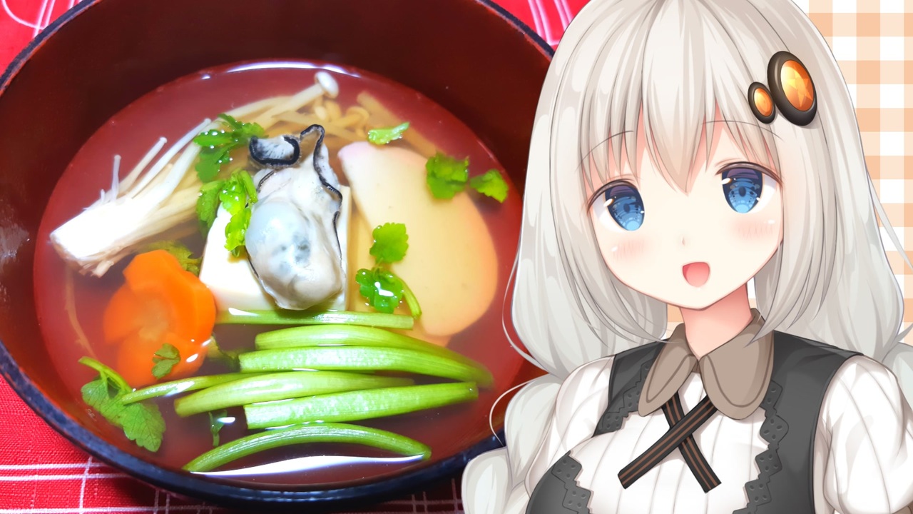 今回は牡蠣を使ったお正月にぴったりなお吸い物を作ります!<br>昆布とかつお節からだしを取って、上品な味に仕上げます!<br>是非とも日本酒のお供にいただきましょう!<br><br>皆様、新年あけましておめでとうございます!<br>2022年も紲星流クッキングをよろしくお願い致します!<br>------------------------------------------------------<br>材料(4人前)<br>〇牡蠣(生食用):150g<br>〇豆腐:1丁<br>〇かまぼこ:4切れ<br>〇ニンジン:50g<br>〇エノキダケ:100g<br>〇ショウガ:1片<br>〇セリ:100g<br>だし汁<br>●水:5カップ(1リットル)<br>●昆布:10g<br>●かつお節:10g<br>●醤油:小さじ2<br>●塩:小さじ1/2<br>●酒:大さじ2<br>●みりん:大さじ1<br>牡蠣の下処理<br>◎片栗粉または塩:適量<br>◎水:適量<br><br>今回登場したお酒:宮城県 新澤醸造店様 伯楽星 純米大吟醸<br>-------------------------------------------------------<br><br><strong>いつもたくさんのコメント・広告・マイリスト登録・いいねありがとうございます!</strong><br><br>立ち絵:むらの様<br>素材:ニコニコモンズ様・写真AC様・効果音ラボ様<br><br>次回⇒「チャーハン雑炊」<a href="https://www.nicovideo.jp/watch/sm39932345" class="watch">sm39932345</a><br>前回⇒「グリンピースのポタージュ」<a href="https://www.nicovideo.jp/watch/sm39808510" class="watch">sm39808510</a><br>一覧リスト⇒<a href="https://www.nicovideo.jp/mylist/71603494" target="_blank" rel="noopener">mylist/71603494</a><br><br>レトロゲーム実況シリーズ⇒<a href="https://www.nicovideo.jp/mylist/59467034" target="_blank" rel="noopener">mylist/59467034</a><br>ボイロの簡単おつまみシリーズ⇒<a href="https://www.nicovideo.jp/mylist/67487760" target="_blank" rel="noopener">mylist/67487760</a><br>ゲーム実況以外に制作したもの⇒<a href="https://www.nicovideo.jp/mylist/63059415" target="_blank" rel="noopener">mylist/63059415</a><br>ボイロラジオ⇒<a href="https://www.nicovideo.jp/mylist/65848554" target="_blank" rel="noopener">mylist/65848554</a><br>いただいた素敵なイラスト⇒<a href="https://seiga.nicovideo.jp/clip/2154778" target="_blank" rel="noopener">clip/2154778</a><br><br>Twitter⇒<a href="https://twitter.com/fio_kamo" target="_blank" rel="noopener nofollow">https://twitter.com/fio_kamo</a><br>