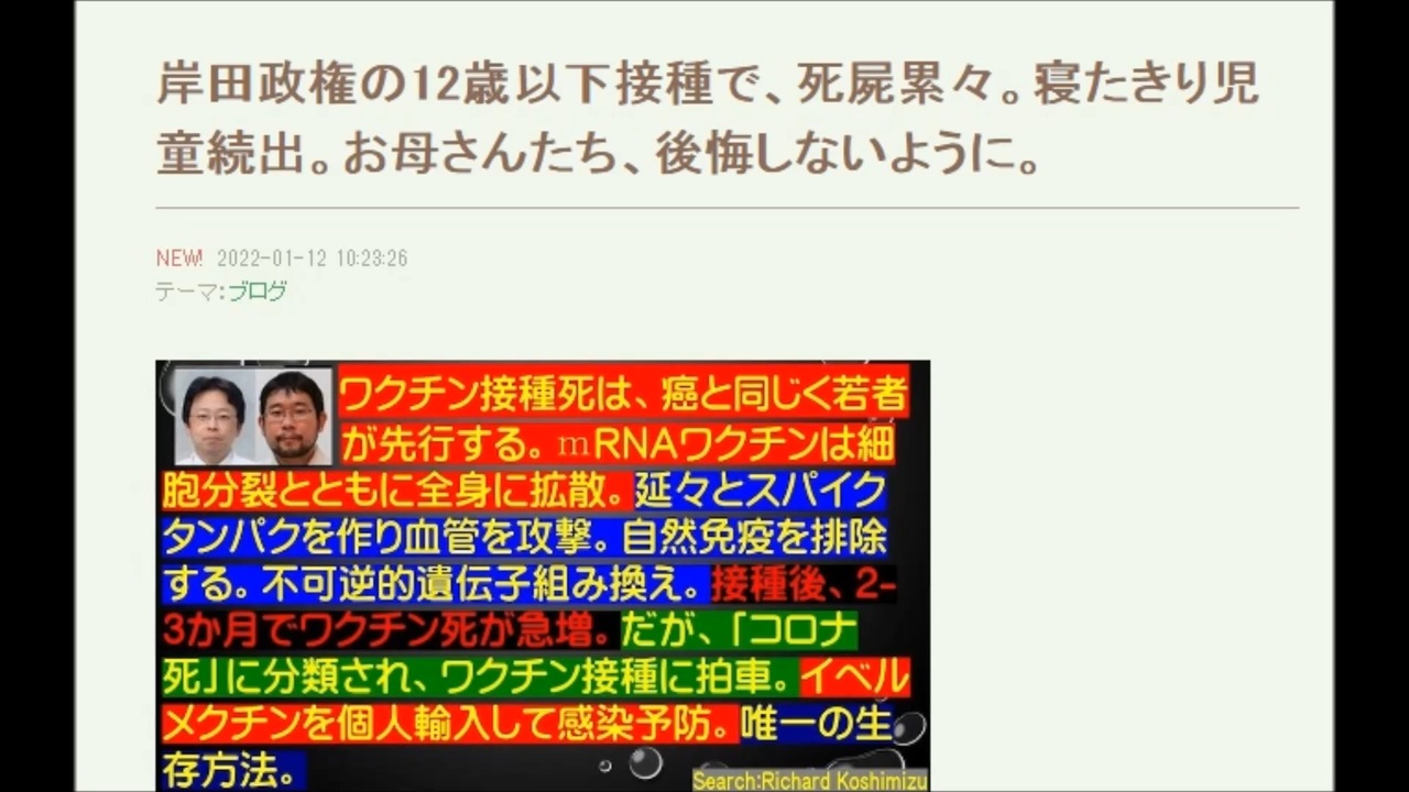 引用元<br>richardneversurrenderのブログ<br><a href="https://ameblo.jp/richardneversurrender/" target="_blank" rel="noopener nofollow">https://ameblo.jp/richardneversurrender/</a><br>YouTubeにもUpしましたが即座に削除されました。これ以前の最近のものは今の所通っています。<br>イベルメクチンが必須です。<br>政府はアビガンを(最低でも200万人分)持っています。備蓄品はいざという時に最も役に立つものです。今がその時です。意味は分りますか?<br><br />日月神示に<br>『「死ぬことで助ける」と「生かすことで助ける」の状況はあるが‥』との表現があります<br>これから先(12年程度)の辛苦さを示しているとも思えます<br>『食糧難の混乱、無政府状態から同胞を食する人まで現れる』とも<br>今日明日の食事で死を覚悟しなければならない家族と、ある程度(食について)安泰な人が混在した時、一体何が起こるだろうか<br>"今だけ" の駄賃を貰ってDS側に付いている人は、自らの行いがより強烈な地獄に向かわせていることに気付いて欲しい<br><br>ロックフェラーやロスチャイルドでさえ、そんな地獄の様相の上に立てたとて、果たして幸福や安泰で居られるだろうか<br>日月には『空を飛ぶ人と地を這う人に分かれる』とあった<br>移動には航空機を使って(会合を)回避するのかも知れないが、一歩外を見回せば地獄‥<br>そんな世界を標榜する‥ 今の時点で既に狂気としか思えない<br>今ある豊かさや文化などたちまち崩壊するだろうし、航空機を製造維持するコミュニティーなど数万人で出来る訳がない<br>十億人を残すと目論んでいるのかも知れないが、殆どがゾンビのような体(脳を含めて)では墜落が頻発するものしか造れないだろう<br><br>一方、『死ぬことで助ける』という側面があるなら‥<br>何が正しく何がそうでないのか‥<br>確かに強弁(自らは正しいと思い込むこと)そのものがより悲惨をもたらすことも‥<br>それらの側面というのは、同一平面というより上下の関係になっていることの方が多そうだ<br>余りに上の立場からの側面など、英知吸収の途上からは認識しようがない<br><br><br>このIDはウクライナ関連動画(複数)でアカウント制限(投稿不可)になったため別アカを作りました<br><a href="https://www.nicovideo.jp/user/126388289" target="_blank" rel="noopener nofollow">https://www.nicovideo.jp/user/126388289</a>