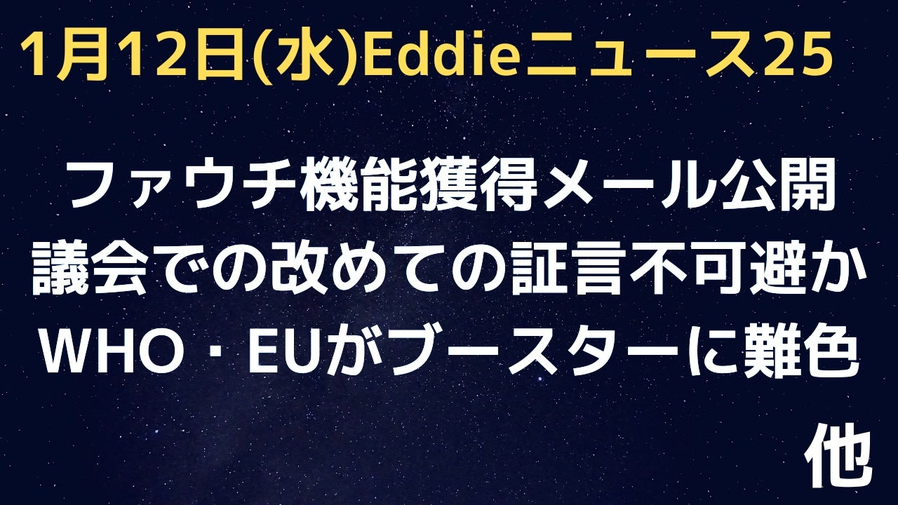 参考URL<br>ファウチ新メールで、改めてインタビューが必要と申し入れ<br><a href="https://republicans-oversight.house.gov/wp-content/uploads/2022/01/Letter-Re.-Feb-1-Emails-011122.pdf" target="_blank" rel="noopener nofollow">https://republicans-oversight.house.gov/wp-content/uploads/2022/01/Letter-Re.-Feb-1-Emails-011122.pdf</a><br><br>WHOがブースター接種に難色 別の新しいワクチンが必要<br><a href="https://www.ndtv.com/world-news/coronavirus-who-experts-repeating-booster-doses-not-a-viable-strategy-against-emerging-variants-2702447" target="_blank" rel="noopener nofollow">https://www.ndtv.com/world-news/coronavirus-who-experts-repeating-booster-doses-not-a-viable-strategy-against-emerging-variants-2702447</a><br><br>EUもブースターに警告 「免疫系に悪影響」<br><a href="https://www.bloomberg.co.jp/news/articles/2022-01-11/R5K5LCT0G1KZ01" target="_blank" rel="noopener nofollow">https://www.bloomberg.co.jp/news/articles/2022-01-11/R5K5LCT0G1KZ01</a><br><br><br />Eddieと申します。<br>少し引棒めいたニュースを集めて喋っています。<br>よろしくお願いします。<br><br>23時過ぎYouTubeライブ配信(マイペース配信中)<br>「Eddieのホンマやと思うニュース3」<br><a href="https://www.youtube.com/channel/UCKaftD6X-qeHC5Vd9CMCedw" target="_blank" rel="noopener nofollow">https://www.youtube.com/channel/UCKaftD6X-qeHC5Vd9CMCedw</a><br><br>ニコ生は毎週土曜21時半〜(もしくは日曜21時半〜)<br><br>twitter<br>@Eddie2travel<br><br>YouTubeライブ配信1000回記念グッズなど販売中<br><a href="https://suzuri.jp/Eddie-Homma3" target="_blank" rel="noopener nofollow">https://suzuri.jp/Eddie-Homma3</a><br><br>