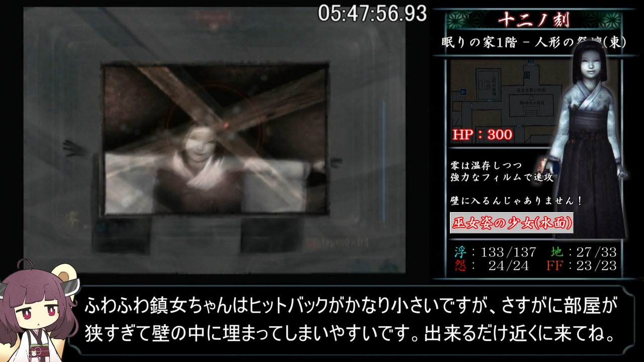 中盤にRTAっぽい解説を入れてみました。<br><br>↓回避ルートの参考にさせていただいたばじょーさんのAny%<br>※動画内で言及したタイムは、ちょっと古めの記録でした。すみません。<br><a href="https://www.youtube.com/watch?v=oePd72H_KQk" target="_blank" rel="noopener nofollow">https://www.youtube.com/watch?v=oePd72H_KQk</a><br><br><strong>~追記~<br>Q. <a href="#" class="seekTime" data-seekTime="12:48" onclick="seekNicoPlayer('#12:48'); return false;">#12:48</a> きりたんこんな表情もあったのかい<br>A. akihiyoさんのきりたん立ち絵はpsdファイル同梱で、<br> エモーション11+表情2+目19+口18+眉11+体3種あるので<br> 248,292通りの立ち絵を作れるゾ(宣伝)</strong><br><br>2周目十一ノ刻後半戦開始~螢おじ消滅(3時間振り2度目)まで<br><br><a href="https://www.nicovideo.jp/watch/sm39878630" class="watch">sm39878630</a>←前|<a href="https://www.nicovideo.jp/mylist/71775161" target="_blank" rel="noopener">mylist/71775161</a>|次→<a href="https://www.nicovideo.jp/watch/sm39909414" class="watch">sm39909414</a><br><br>RTA part1集 <a href="https://www.nicovideo.jp/mylist/71936684" target="_blank" rel="noopener">mylist/71936684</a><br><br>あかりちゃん→<a href="https://seiga.nicovideo.jp/seiga/im10882977" target="_blank" rel="noopener">im10882977</a><br><br><strong><u>▼参考サイト様等</u></strong><br>・攻略フルーツ - 零 刺青の聲 - <a href="https://xn--cool-kk4csd1lrc8dvi.xyz/zero-koe/" target="_blank" rel="noopener nofollow">https://xn--cool-kk4csd1lrc8dvi.xyz/zero-koe/</a><br>・零~刺青ノ聲~ 公式完全攻略本 導魂之書 - 株式会社エンターブレイン<br><br><strong><u>▼お借りした素材達</u></strong><br>・【akihiyo様】:立ち東北きりたん素材 - <a href="https://seiga.nicovideo.jp/seiga/im10601764" target="_blank" rel="noopener">im10601764</a><br>・【hiropon様】:指さし棒 - <a href="https://commons.nicovideo.jp/works/nc190353" target="_blank" rel="noopener">nc190353</a><br>・【公式様】:東北ずん子のイラスト/3Dデータ - <a href="https://zunko.jp/con_illust.html" target="_blank" rel="noopener nofollow">https://zunko.jp/con_illust.html</a><br><br><strong><u>▼プレイ環境</u></strong><br>・本体(実機):SCPH-30000<br>・コントローラ:SCPH-10010<br>・ディスク:廉価版のやつ<br><br><strong><u>▼レギュレーション/縛り等</u></strong><br>・計測開始:1周目開始時New GameからNormalを選択した瞬間<br>・計測終了:2周目終了時リザルト画面にて「霊リスト:217/217」が表示された瞬間<br>・難易度は2周ともNormal<br>・エンディングは2周ともノーマルエンド<br>・バグ技はなんでもあり