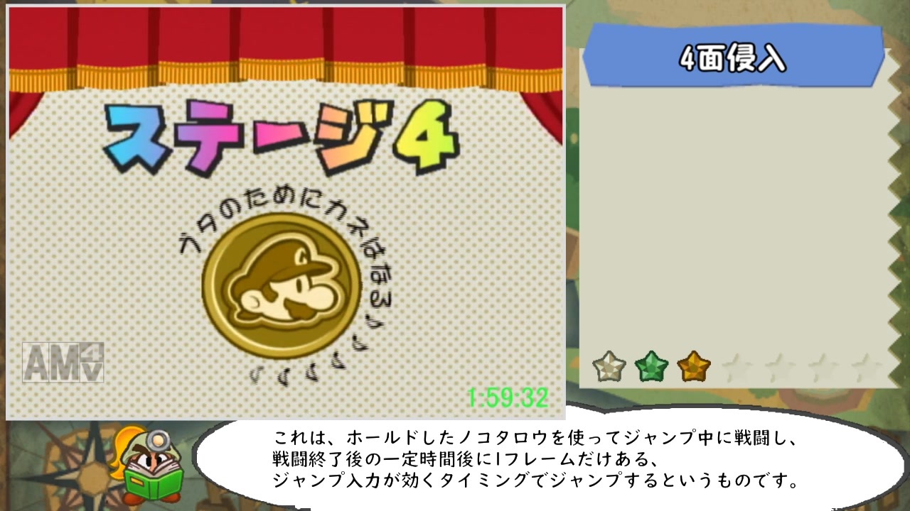 古戦場のおともに初投稿です。<br>私生活が忙しいので投稿頻度落ちそうです。<br><br>ペーパーマリオRPGの"All Crystal Stars"RTA動画です.<br>All Crystal Starsとはすべてのスターストーンを集めたうえでクリアするまでのタイムを競うRTAです.なんでそんなカテゴリ作る必要があるんですか(正論)<br>以前投稿したAny%の動画と被る部分もありますが,そちらの記録動画を見ていなくても理解できるように編集しています.<br><br><span style="color: #00ff00;">※この動画の一部または全部を外部サイト等に転載することを禁じます.<br>但し,動画紹介等の理由で動画の一部を引用することは認めます.</span><br><br><a href="https://www.nicovideo.jp/watch/sm39856099" class="watch">sm39856099</a> ←前 次→ <a href="https://www.nicovideo.jp/watch/sm39990560" class="watch">sm39990560</a><br><br>part1マイリスト <a href="https://www.nicovideo.jp/mylist/61207798" target="_blank" rel="noopener">mylist/61207798</a><br><br>ゴールドスター~ランペル戦1回目まで<br><br>・環境<br>Wii,コントローラ(純正),アマレコTV,GV-USB2<br><br><span style="font-size: 14px;">広告ありがとうございます.<br><br>SNSで共有してくれている兄貴達もありがとうございます.</span><br><br><br>speedrun.com:Celery<br>コミュニティ:co3668387