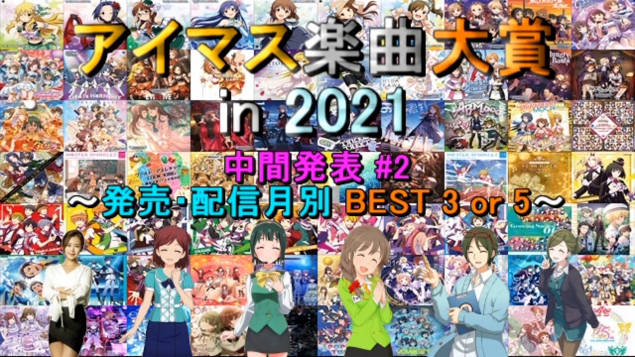 <span style="color: #ff0000;"><strong>2021年にFull音源版が発売 or 配信</strong></span>されたアイマス関連の楽曲<br>(<span style="color: #0000ff;"><strong>計132曲</strong></span>)に対する人気投票企画の中間発表2回目です。<br>参加者<span style="color: #00ff00;"><strong>1000名</strong></span>の時点の結果から、<span style="color: #f1c232;"><strong>各月に発売・配信された楽曲の<br>獲得pt上位5曲</strong></span>をそれぞれご紹介します(<span style="color: #9900ff;"><strong>5~8月は3曲</strong></span>紹介)。<br><br>※紹介順は<span style="color: #980000;"><strong>その時点の順位に関係なくランダム</strong></span>です。<br><br><span style="font-size: 24px;"><strong>※最終結果投稿しました!:<a href="https://www.nicovideo.jp/watch/sm40051321" class="watch">sm40051321</a></strong></span><br><br>☆投票対象一覧:<a href="https://naotosiroyamahe.hatenablog.com/entry/2022/01/01/120000" target="_blank" rel="noopener nofollow">https://naotosiroyamahe.hatenablog.com/entry/2022/01/01/120000</a><br><br>○告知動画:<a href="https://www.nicovideo.jp/watch/sm39828622" class="watch">sm39828622</a><br>○中間1回目(シリーズ別):<a href="https://www.nicovideo.jp/watch/sm39881420" class="watch">sm39881420</a><br>○中間3回目(5pt票率):<a href="https://www.nicovideo.jp/watch/sm39968314" class="watch">sm39968314</a><br><br>●「アイマス楽曲大賞 最終結果まとめ」:<a href="https://www.nicovideo.jp/mylist/70533939" target="_blank" rel="noopener">mylist/70533939</a><br>●『アイマス楽曲ランキングシリーズ』:<a href="https://www.nicovideo.jp/mylist/57911966" target="_blank" rel="noopener">mylist/57911966</a><br>●『THE IDOLM@STER Song Collection』:<a href="https://www.nicovideo.jp/mylist/61493969" target="_blank" rel="noopener">mylist/61493969</a><br>