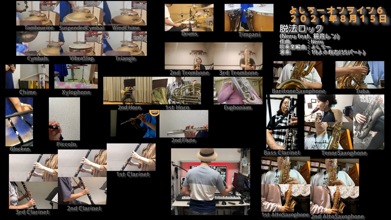 ども、よしうーです!<br><br>ネット上で演奏者の皆さんに声をかけさせていただき、<br>バーチャル合奏吹奏楽をやりました!<br>その名も「よしうーの吹奏楽編曲をオンラインでバーチャル合奏しよう(略:よしうーオンライン)」!<br><br>2021年夏に開催した第6弾!<br>「よしうーオンライン6」と称して3曲収録したものの2曲目!<br>Neruさんのボカロ曲「脱法ロック」を演奏しました!<br><br>最近のAdoさんの「阿修羅ちゃん」に通じるものがある、パリピな曲ですね!キメの部分はなかなか合わせるのが難しかったですね…w<br><br>★使用した楽譜はBOOTHで頒布しています!★<br><a href="https://yoshiuh.booth.pm/items/3544186" target="_blank" rel="noopener nofollow">https://yoshiuh.booth.pm/items/3544186</a><br><br>★打ち込みバージョン★<br><a href="https://www.nicovideo.jp/watch/sm37132832" class="watch">sm37132832</a><br><br><br><br>作詞・作曲・編曲:Neru<br>(原曲:<a href="https://www.youtube.com/watch?v=u5mHVUwDf_0" target="_blank" rel="noopener nofollow">https://www.youtube.com/watch?v=u5mHVUwDf_0</a> )<br>吹奏楽編曲・ミックス・マスタリング:よしうー (<a href="https://twitter.com/swo_yoshiuh" target="_blank" rel="noopener nofollow">https://twitter.com/swo_yoshiuh</a> )<br><br>演奏人数:19人(35パート)<br><br><br /><br><strong>◆NicoFT始めました!◆</strong><br>パートナーパスで応援よろしくお願いします!<br><a href="https://nicoft.io/collections/yoshiuh-collection" target="_blank" rel="noopener nofollow">https://nicoft.io/collections/yoshiuh-collection</a><br><br><strong>◆おすすめ動画◆</strong><br>【OSTERproject】「ミラクルペイント」を吹奏楽にしてみた<br><a href="https://www.nicovideo.jp/watch/sm45650436" class="watch">sm45650436</a><br>(投稿動画一覧:<a href="https://www.nicovideo.jp/user/5489948/video" target="_blank" rel="noopener nofollow">https://www.nicovideo.jp/user/5489948/video</a> )<br><br>◆マイリスト◆<br>吹奏楽編曲:<a href="https://www.nicovideo.jp/mylist/26732699" target="_blank" rel="noopener">mylist/26732699</a><br>吹奏楽実演(オフ会・オンライン・他):<a href="https://www.nicovideo.jp/mylist/40220135" target="_blank" rel="noopener">mylist/40220135</a><br>吹奏楽作曲:<a href="https://www.nicovideo.jp/mylist/44259241" target="_blank" rel="noopener">mylist/44259241</a><br>ボカロ:<a href="https://www.nicovideo.jp/mylist/28278100" target="_blank" rel="noopener">mylist/28278100</a><br><br>★★BOOTHで編曲した楽譜も取り扱っています!★★<br>詳細は「<a href="https://yoshiuh.booth.pm/" target="_blank" rel="noopener nofollow">https://yoshiuh.booth.pm/</a> 」へ<br><br>★★編曲雑談Discordを立ち上げました!★★<br>編曲に関するトークや企画もこちらで行う…かも?<br><a href="https://discord.gg/KNAwGbrAuX" target="_blank" rel="noopener nofollow">https://discord.gg/KNAwGbrAuX</a><br><br>★★耳コピサービス始めました★★<br><a href="https://coconala.com/users/2574755" target="_blank" rel="noopener nofollow">https://coconala.com/users/2574755</a>