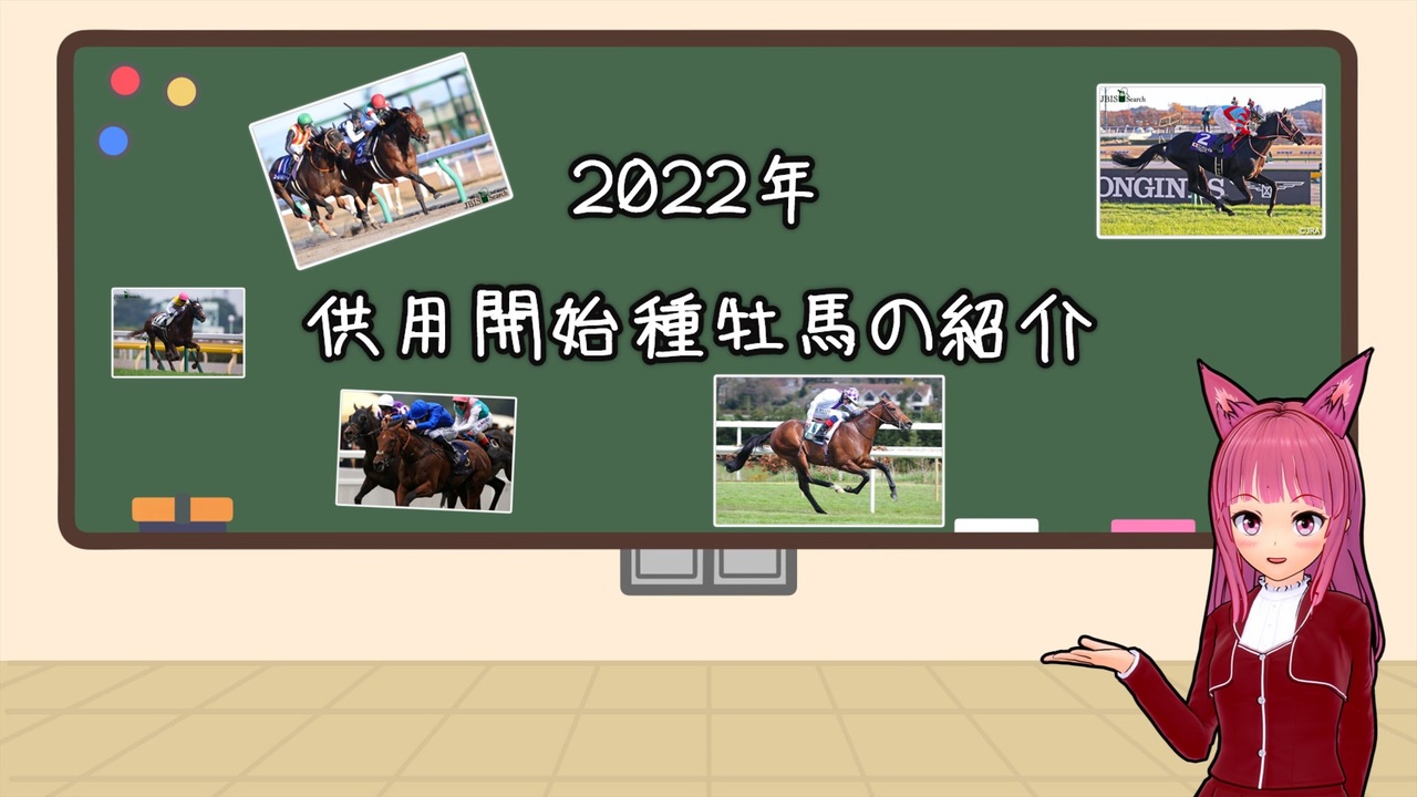 ご視聴ありがとうございます<br><br>今年から種牡馬デビューする馬の情報をまとめました<br>今回は馬の画像が出てきます<br>記載がない場合、JBIS様から画像を引用しています<br><br><br>前回:2021年リーディングサイアーのお話:<a href="https://www.nicovideo.jp/watch/sm39848309" class="watch">sm39848309</a><br>次回:サウジカップを楽しもう:<a href="https://www.nicovideo.jp/watch/sm40058729" class="watch">sm40058729</a><br>競馬解説動画マイリスト:<a href="https://www.nicovideo.jp/mylist/71482582" target="_blank" rel="noopener">mylist/71482582</a><br><br><br>【参考サイト】<br>サラブレッドマーケット様<br><a href="https://thoroughbred-market.com/" target="_blank" rel="noopener nofollow">https://thoroughbred-market.com/</a><br>JBISサーチ様<br><a href="https://www.jbis.or.jp/index.html" target="_blank" rel="noopener nofollow">https://www.jbis.or.jp/index.html</a><br>優駿達の蹄跡<br><a href="https://ahonoora.com/" target="_blank" rel="noopener nofollow">https://ahonoora.com/</a><br><br>BGM:<br>MusMus様<br><a href="https://musmus.main.jp/" target="_blank" rel="noopener nofollow">https://musmus.main.jp/</a><br><br>【他のシリーズ】<br>ウイポの縛りプレイしていました<br>【琴葉姉妹実況】ダーレーアラビアン系禁止縛り【WinningPost9_2020】<br>マイリスト:<a href="https://www.nicovideo.jp/mylist/69657788" target="_blank" rel="noopener">mylist/69657788</a><br>第1回:<a href="https://www.nicovideo.jp/watch/sm37600731" class="watch">sm37600731</a><br><br>他にツーリング動画も上げています<br>ツーリング動画マイリスト:<a href="https://www.nicovideo.jp/mylist/72211996" target="_blank" rel="noopener">mylist/72211996</a><br><br>ツイッター<br><a href="https://twitter.com/MGixxer150" target="_blank" rel="noopener nofollow">https://twitter.com/MGixxer150</a>