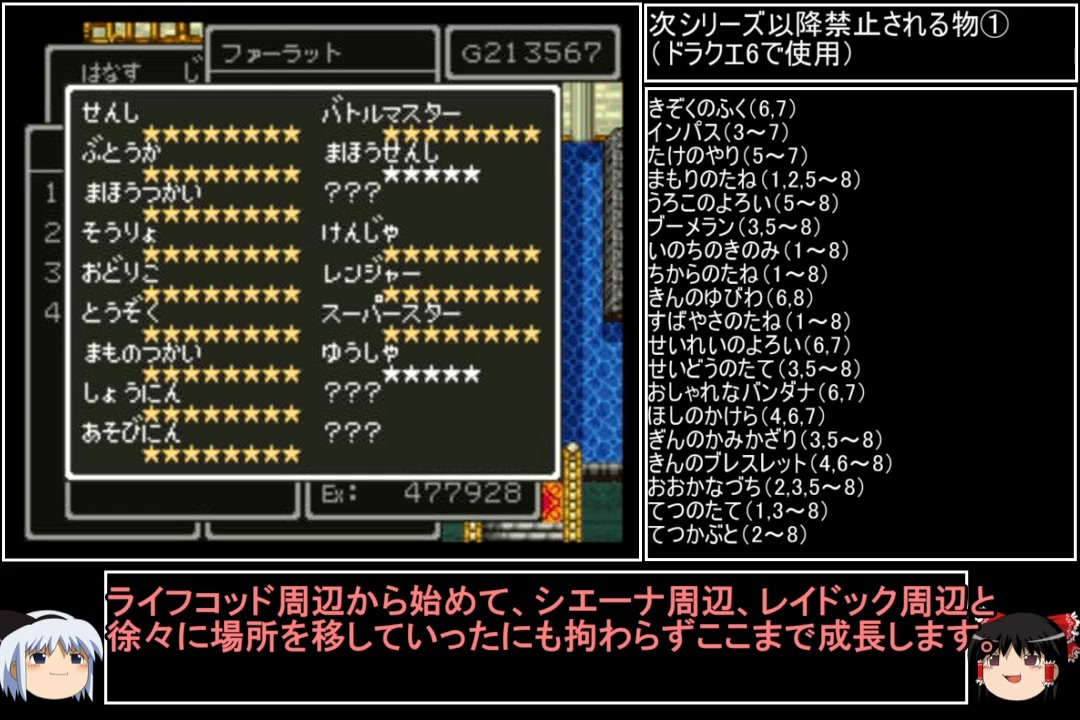 Q、一体これほどの稼ぎ作業をいつの間に?<br>A、年末年始に。色々な動画が投稿されるので最適な片手間でした。<br><br>Q、じゃあ次シリーズ以降は天地魔闘の構え禁止ね。<br>A、暗算は特技ではない。ステータスだ!<br><br>※追記 最後の一覧にはぐれメタルを入れ忘れ。次回入れます!<br><br>前→<a href="https://www.nicovideo.jp/watch/sm39910378" class="watch">sm39910378</a> 次→<a href="https://www.nicovideo.jp/watch/sm39957649" class="watch">sm39957649</a><br><br>YouTube版→<a href="https://youtu.be/tjEfLuEMU4I" target="_blank" rel="noopener nofollow">https://youtu.be/tjEfLuEMU4I</a><br><br><br>※動画の大きさが変わる方は、お手数ですが設定→画質を自動から〇pに変えると解決します。<br>※一部機種は互換機を使用してのプレイとなります。<br><br>縛りルール(不明点はシリーズのQ&Aを参照)<br>①使った武器・防具・装飾品・道具・呪文・特技・一部特殊施設(メダル王・カジノ・移民の町)・職業(3,6,7)・仲間モンスター(4,5,6,8+7の職業)は次以降のシリーズで使用禁止。<br>(NPCキャラが使用した装備や呪文を含む。売却及び錬金素材としても使用扱い)<br><br>②裏技・バグ技の禁止。<br><br>③逃走禁止&戦闘終了時は全員生存。<br><br>④レベルを上げ過ぎない。<br>ダンジョンやボスは公式ガイドブックに記載されたレベル+3まで。<br>ラスボスは全ての呪文を習得するレベル+3程度までに収める。<br><br>⑤裏ボスも規定回数、規定ターン以内に倒す。<br>(6の裏ダンジョン突入時のみ、条件を満たすため①の職業を解禁)<br><br>(おまけ)<br>宝は可能なものに限り全回収。<br>5と6は同一モンスターの仲間不可。<br>回避可能なボスも全て倒す。<br><br><br>この動画で利用している株式会社スクウェア・エニックスを代表とする共同著作者が権利を所有する著作物及びスギヤマ工房有限会社が権利を所有する楽曲の転載・配布は禁止いたします。<br>(C) ARMOR PROJECT/BIRD STUDIO/SQUARE ENIX All Rights Reserved.<br>(C) SUGIYAMA KOBO (P) SUGIYAMA KOBO<br><br>AquesTalk2ライセンスID:AQTK2WINUSR23122185<br /><br><br>❤いいねを押していただけるとモチベーションと投稿速度が上がるので宜しくお願い致します!<br><br>作者ツイッター→ <a href="https://twitter.com/nig0117" target="_blank" rel="noopener nofollow">https://twitter.com/nig0117</a><br>PIXIV FANBOX→ <a href="https://sutanokeiji.fanbox.cc/" target="_blank" rel="noopener nofollow">https://sutanokeiji.fanbox.cc/</a><br><br>( 以前はWEB小説書いてました→ <a href="https://kakuyomu.jp/works/1177354054884910267" target="_blank" rel="noopener nofollow">https://kakuyomu.jp/works/1177354054884910267</a> )