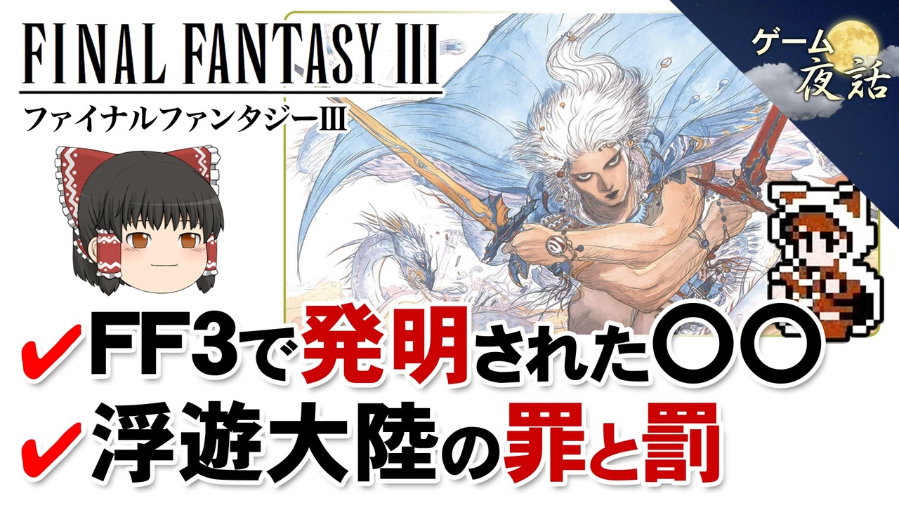 過去動画を宣伝して下さった皆さん、ありがとうございましたm(__)m<br>毎回ひとつのゲームを取り上げ、3つのテーマから解説します。<br>【前編】は毎月1日・15日更新、【後編】は制作状況に応じて更新致します。<br><br>前編・後編合わせて毎回約30分が原則になります。<br><br><strong>▼第113回「FFⅢ」</strong><br>前編:<a href="https://www.nicovideo.jp/watch/sm39902347" class="watch">sm39902347</a><br>後編:<a href="https://www.nicovideo.jp/watch/sm39958881" class="watch">sm39958881</a><br><br>■youtubeはこちら <a href="https://youtu.be/xOchRLC_z2c" target="_blank" rel="noopener nofollow">https://youtu.be/xOchRLC_z2c</a><br>■ゲーム夜話ツイッター <a href="https://twitter.com/gameyawa" target="_blank" rel="noopener nofollow">https://twitter.com/gameyawa</a><br><br>■第112回「DQ2」<br>前編:<a href="https://www.nicovideo.jp/watch/sm39762196" class="watch">sm39762196</a> 中編:<a href="https://www.nicovideo.jp/watch/sm39809375" class="watch">sm39809375</a> 後編:<a href="https://www.nicovideo.jp/watch/sm39828946" class="watch">sm39828946</a><br>■第114回「天地を喰らう」<br>前編:<a href="https://www.nicovideo.jp/watch/sm39982450" class="watch">sm39982450</a><br><br>■ゲーム夜話マイリスト <a href="https://www.nicovideo.jp/mylist/56973971" target="_blank" rel="noopener">mylist/56973971</a><br><br><span style="color: #000000; font-size: 13px;">■ゲームジャンル別マイリスト</span><br>・RPG <a href="https://www.nicovideo.jp/mylist/69852172" target="_blank" rel="noopener">mylist/69852172</a><br>・アクション <a href="https://www.nicovideo.jp/mylist/69852179" target="_blank" rel="noopener">mylist/69852179</a><br>・アクションRPG <a href="https://www.nicovideo.jp/mylist/69852177" target="_blank" rel="noopener">mylist/69852177</a><br>・アドベンチャー <a href="https://www.nicovideo.jp/mylist/69852182" target="_blank" rel="noopener">mylist/69852182</a><br>・アクションアドベンチャー <a href="https://www.nicovideo.jp/mylist/69852188" target="_blank" rel="noopener">mylist/69852188</a><br>・シミュレーション <a href="https://www.nicovideo.jp/mylist/69852189" target="_blank" rel="noopener">mylist/69852189</a><br>・ホラー <a href="https://www.nicovideo.jp/mylist/69852194" target="_blank" rel="noopener">mylist/69852194</a><br>・サウンドノベル <a href="https://www.nicovideo.jp/mylist/69852197" target="_blank" rel="noopener">mylist/69852197</a><br><br>© 1990, 2021 SQUARE ENIX CO., LTD. All Rights Reserved.<br>LOGO ILLUSTRATION: © 2006 YOSHITAKA AMANO<br><br>
