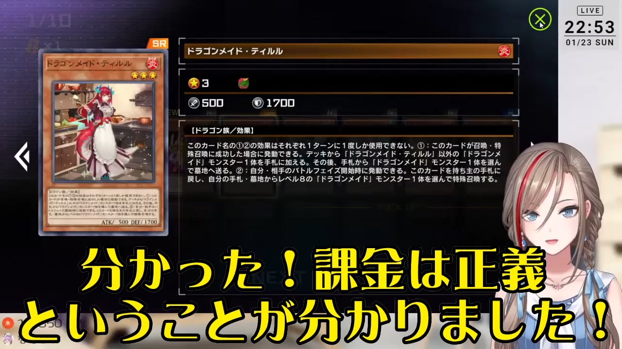 遂に夏芽先生が課金の沼に入ってしまった。<br>今回はビギナーズラックで良いカード引いたが、沼に入っていきそう・・・<br>本編<br><a href="https://www.youtube.com/watch?v=GHengHUfk24" target="_blank" rel="noopener nofollow">https://www.youtube.com/watch?v=GHengHUfk24</a><br>来栖夏芽<br><a href="https://www.youtube.com/channel/UCRcLAVTbmx2-iNcXSsupdNA" target="_blank" rel="noopener nofollow">https://www.youtube.com/channel/UCRcLAVTbmx2-iNcXSsupdNA</a><br>にじさんじ所属バーチャルライバーの来栖夏芽(くるすなつめ)と申しますわ。<br>音楽とゲームを好んでおりますの!<br>今回はちょっとカードを見るだけ!様子をうかがうだけ!<br>ほんとです!!ほんとなんです!!!<br>ちょっと!ちょっとだけだから――――!!!!!!<br>※遊戯王はあまりわかっていない超初心者です!お手柔らかに……!<br>★このたび!<br>KADOKAWA MF文庫Jが贈る新文芸小説にて<br>『人外教室の人間嫌い教師』という作品で<br>作家デビューすることが決まりました!!<br>『人外教室の人間嫌い教師』公式ツイッター<br><a href="https://twitter.com/jingaikyoshitsu" target="_blank" rel="noopener nofollow">https://twitter.com/jingaikyoshitsu</a><br>――彼女たちは人間じゃない。けれど、誰よりも人間に憧れている。<br>『人外教室の人間嫌い教師 ヒトマ先生、私たちに人間を教えてくれますか……?』<br>定価1300円(+税)<br>2022/2/25発売<br>#人外教室<br>作品に関するお問い合わせ:<a href="https://bit.ly/3plgXI2" target="_blank" rel="noopener nofollow">https://bit.ly/3plgXI2</a><br>配信見てくれてありがとう!!<br>キャンディナちゃんがかわいいってことだけ知ってます<br>遊戯王マスターデュエル<br>ゲームを閲覧<br>なつめぇ牧場<br>#来栖夏芽 #にじさんじ #バーチャルYouTuber