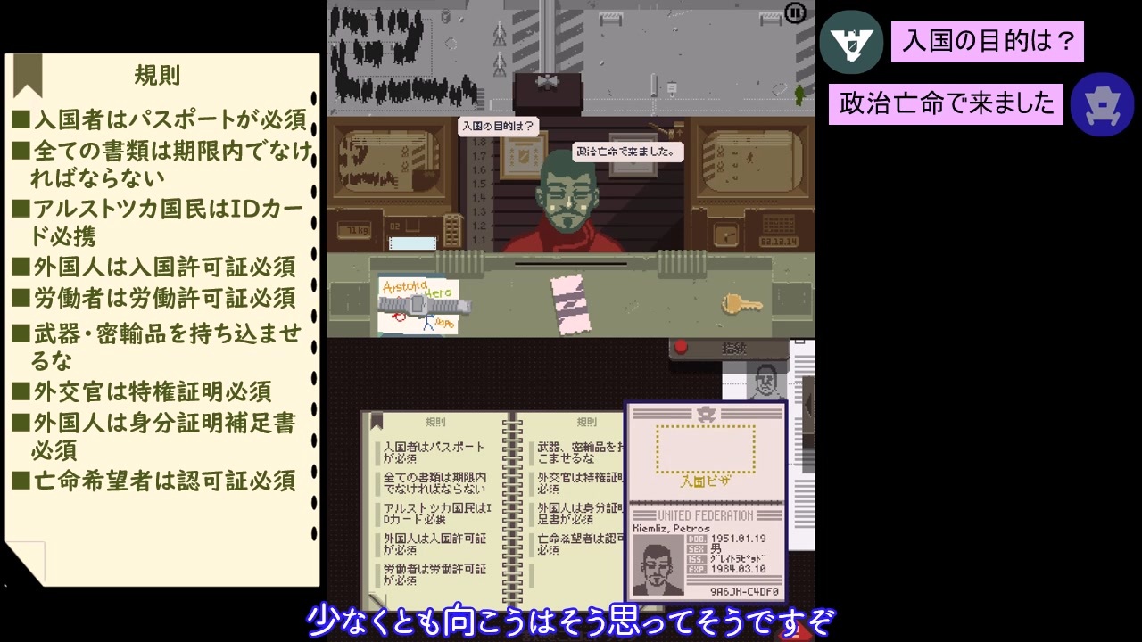 前回の動画にコメント、差し入れ、広告、いいね等ありがとうございました!<br>基本カットなしの垂れ流し動画です。<br>ゲーム内の会話の字幕は、定型文のようなセリフは字幕を省かせて頂いております。<br><br>相変わらず思いつくままに会話させているので、会話があっちこっちに飛んでるし身のない会話しかありませんがよろしくお願いいたします。<br><br>※この動画ではコメ返等を行うおまけのお時間はありません。ご容赦ください。<br><br>*注意*<br>・ゆっくりボイスの使用<br>・ツイステのメインストーリー、パソストのネタバレの可能性あり<br>・口調、キャラ崩壊の可能性あり<br>・妄想、捏造を含む<br>・腐コメ、夢コメ、誹謗中傷コメはご遠慮ください<br>・ドット絵ですが銃、手榴弾、人が死ぬ描写等暴力的表現あり<br>・ドット絵ですが男女の下着姿あり<br>・なるべくネタバレとなるようなコメントはお控えください<br><br><br>【ゲーム】<br>『Papers,Please』iPad版<br><br>【編集】<br>・ゆっくりMovieMaker4<br><br>ご用のある方はこちらまで↓<br>Twitter:@rindoct83_2525<br>マシュマロ:<a href="https://marshmallow-qa.com/rindoct83_2525?utm_medium=twitter&utm_source=promotion" target="_blank" rel="noopener nofollow">https://marshmallow-qa.com/rindoct83_2525?utm_medium=twitter&utm_source=promotion</a>