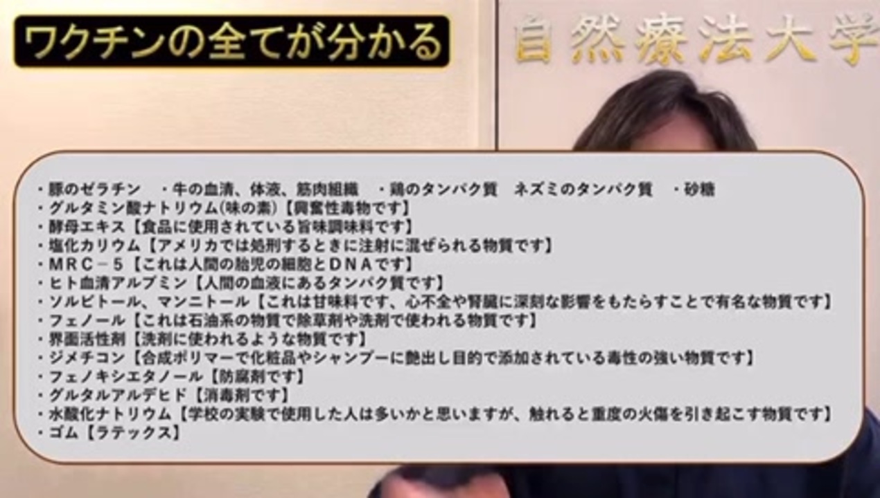ワクチンと言うものに入っている物がこちら。水銀、ホルマリン、アルミニウム、抗生物質、豚のゼラチン、牛の血清、体液、筋肉組織、鶏のタンパク質、ネズミのタンパク質、砂糖、グルタミン酸ナトリウム(味の素)、酵母エキス、塩化カリウム、胎児の細胞とDNA、ヒト血清アルブミン、ソルビトール、マンニトール、フェノール、界面活性剤・・・・etc<br><br>さて、今回の毒ワクチンには何が入っているのでしょうか?<br>① <a href="https://www.nicovideo.jp/watch/sm39370935" target="_blank" rel="noopener nofollow">https://www.nicovideo.jp/watch/sm39370935</a><br>② <a href="https://www.nicovideo.jp/watch/sm39446472" target="_blank" rel="noopener nofollow">https://www.nicovideo.jp/watch/sm39446472</a><br>③ <a href="https://www.nicovideo.jp/watch/sm39926144" target="_blank" rel="noopener nofollow">https://www.nicovideo.jp/watch/sm39926144</a><br><br>元動画 <a href="https://www.youtube.com/watch?v=KpKZAyYLbJg" target="_blank" rel="noopener nofollow">https://www.youtube.com/watch?v=KpKZAyYLbJg</a><br><br>視聴必須動画 <a href="https://www.nicovideo.jp/watch/sm39651404" target="_blank" rel="noopener nofollow">https://www.nicovideo.jp/watch/sm39651404</a><br>