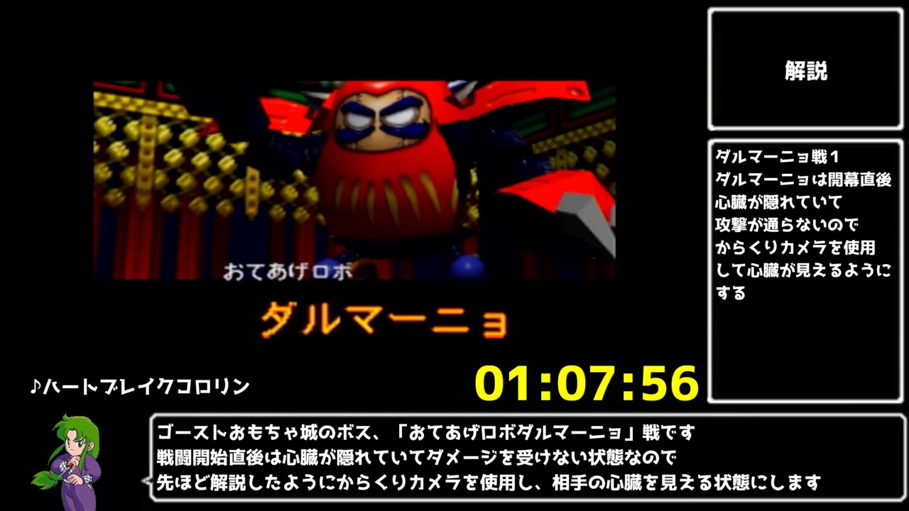 前⇒<a href="https://www.nicovideo.jp/watch/sm39898267" class="watch">sm39898267</a><br>次⇒<a href="https://www.nicovideo.jp/watch/sm40012156" class="watch">sm40012156</a><br>マイリスト⇒<a href="https://www.nicovideo.jp/mylist/72170340" target="_blank" rel="noopener">mylist/72170340</a><br><br>てんぷる城クリア後~おもちゃ城クリアまで<br>今回で地球本土最後の攻略となり、次回はいよいよ宇宙へ行きます!<br><br>計測開始:ゲームをリセットした瞬間<br>計測終了:ラスボスのド・エトワールを撃破し画面がホワイトアウトした瞬間<br><br>普段はTwitch( <a href="https://www.twitch.tv/koryuta_dayo" target="_blank" rel="noopener nofollow">https://www.twitch.tv/koryuta_dayo</a> )にてRTA配信をやっています<br>この動画をきっかけに、普段のRTA配信にも興味を持っていただけたら幸いです<br><br>ゴエモンRTA用のdiscordのサーバーを作ってみました!<br>(64作品が主ですが)ゴエモンRTAについて詳しく知りたい方はご利用ください!<br>⇒<a href="https://discord.gg/s2dV7XjPJS" target="_blank" rel="noopener nofollow">https://discord.gg/s2dV7XjPJS</a><br><br>