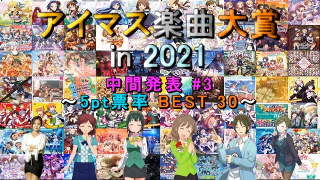 <span style="color: #ff0000;"><strong>2021年にFull音源版が発売 or 配信</strong></span>されたアイマス関連の楽曲<br>(<span style="color: #0000ff;"><strong>計132曲</strong></span>)に対する人気投票企画の中間発表3回目です。<br><span style="color: #00ff00;"><strong>参加者1500名</strong></span>の時点の結果から、<span style="color: #f1c232;"><strong>5pt票率の上位30曲</strong></span>をご紹介します。<br><br>※5pt票率=<span style="color: #ff00ff;"><strong>各楽曲の獲得5pt票数</strong></span>÷<span style="color: #00ffff;"><strong>各楽曲の獲得総票数</strong></span><br>※同率の順位の場合は順位右に「<span style="color: #9900ff;"><strong>T</strong></span>」を表示。<br><br><span style="font-size: 24px;"><strong>※最終結果投稿しました!:<a href="https://www.nicovideo.jp/watch/sm40051321" class="watch">sm40051321</a></strong></span><br><br>☆投票対象一覧:<a href="https://naotosiroyamahe.hatenablog.com/entry/2022/01/01/120000" target="_blank" rel="noopener nofollow">https://naotosiroyamahe.hatenablog.com/entry/2022/01/01/120000</a><br><br>○告知動画:<a href="https://www.nicovideo.jp/watch/sm39828622" class="watch">sm39828622</a><br>○中間2回目(発売・配信月別):<a href="https://www.nicovideo.jp/watch/sm39919346" class="watch">sm39919346</a><br><br>●「アイマス楽曲大賞 最終結果まとめ」:<a href="https://www.nicovideo.jp/mylist/70533939" target="_blank" rel="noopener">mylist/70533939</a><br>●『アイマス楽曲ランキングシリーズ』:<a href="https://www.nicovideo.jp/mylist/57911966" target="_blank" rel="noopener">mylist/57911966</a><br>●『THE IDOLM@STER Song Collection』:<a href="https://www.nicovideo.jp/mylist/61493969" target="_blank" rel="noopener">mylist/61493969</a><br><br>