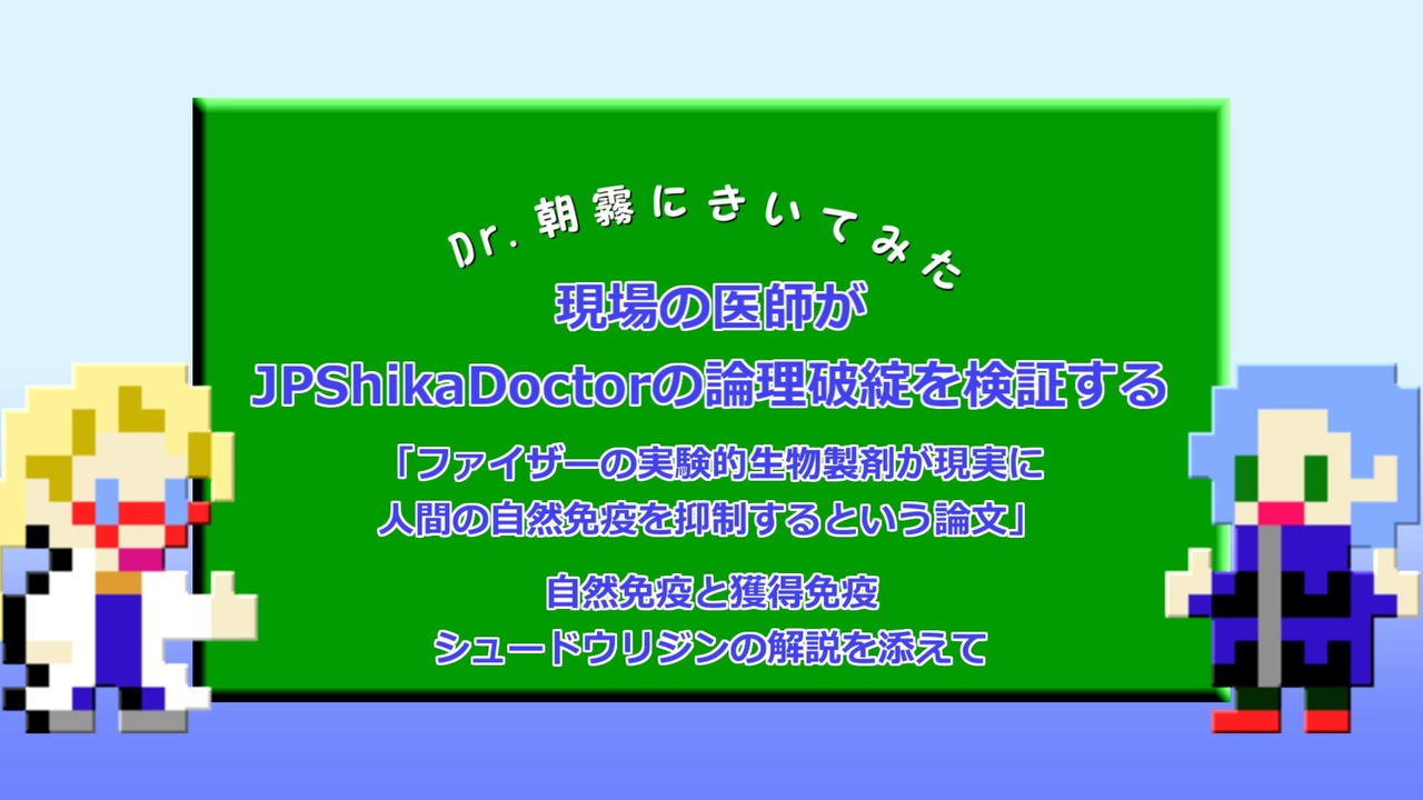 新型コロナウイルス感染症(COVID-19)の最前線で働く医師が反ワクチン派医師の論理破綻を解説します。反ワクチン派の人たちは自分たちが何を聞き、どういう人を信じているのか改めて考え直してください。<br>(追記)朝霧先生より「1-メシル-シュードウリジン(m1Ψ)は人体でも合成、分解される物質なので永久に残り続ける事はあり得ない。(RNA (2012), 18:412–420. )」とのことです。<br>参考文献:動画内に記載<br>この動画は監修者の意向によりギフトは受け付けておりません。<br><br>前の動画 <a href="https://www.nicovideo.jp/watch/sm39911215" class="watch">sm39911215</a> その前の動画 <a href="https://www.nicovideo.jp/watch/sm39843199" class="watch">sm39843199</a><br>Twitter:<a href="https://twitter.com/Dombom_Ex" target="_blank" rel="noopener nofollow">https://twitter.com/Dombom_Ex</a><br><br> <strong>注意(</strong> 以下に同意いただけない方はブラウザバックをお願い致します。<strong>)</strong><br>・この動画の登場人物はフィクションであり、実際の団体、個人とは一切関係がございません。また特定の論理、信仰的思想の教養あるいは批判を意図したものではございません。<br>・ この動画の内容は医学的・論理的根拠を保証するものではありません。この動画を参考にして生じた不利益に関して投稿者は一切の責任を負いません。<br>・ 新型コロナウイルス感染およびワクチンに関しては厚生労働省あるいは各研究機関の発表をご参照ください。<br><br>参考文献・引用文書:動画内に記載<br>仕様ツール・ソフト<br>・ aviutl version 1.10 ・ AoiSupport v1.1.0<br>・ VOICEVOX バージョン0.9.3(四国めたん、波音リツ、ずんだもん、春日部つむぎ)<br>プラグイン<br>・ 拡張編集version 0.92 by KENくん ・ PSDTooLKitAssist v0.2beta56<br>・ rikkyメモリ管理プラグインver0.6b ・ ごちゃまぜドロップスv0.3.25<br>・ AviUtlスクリプト一式 by さつき ・ L-SMAH Works File Reader r940<br>・ 拡張x269出力(GUI)Ex 2.68 by rigaya<br>BGM・SE・素材<br>・ ビシッとツッコミ(漫才演出に) ・ 決定、ボタン押下33(soundeffect-lab)<br>・ White Colors Inc. written by Anonyment ・ 他愛のない話 written by KK<br>・ 神隠しの真相 written by しゃろう・ 【カット編集に最適】水曜どうでしょう/キンコン♪【高音質】<br>・いらすとや<br>