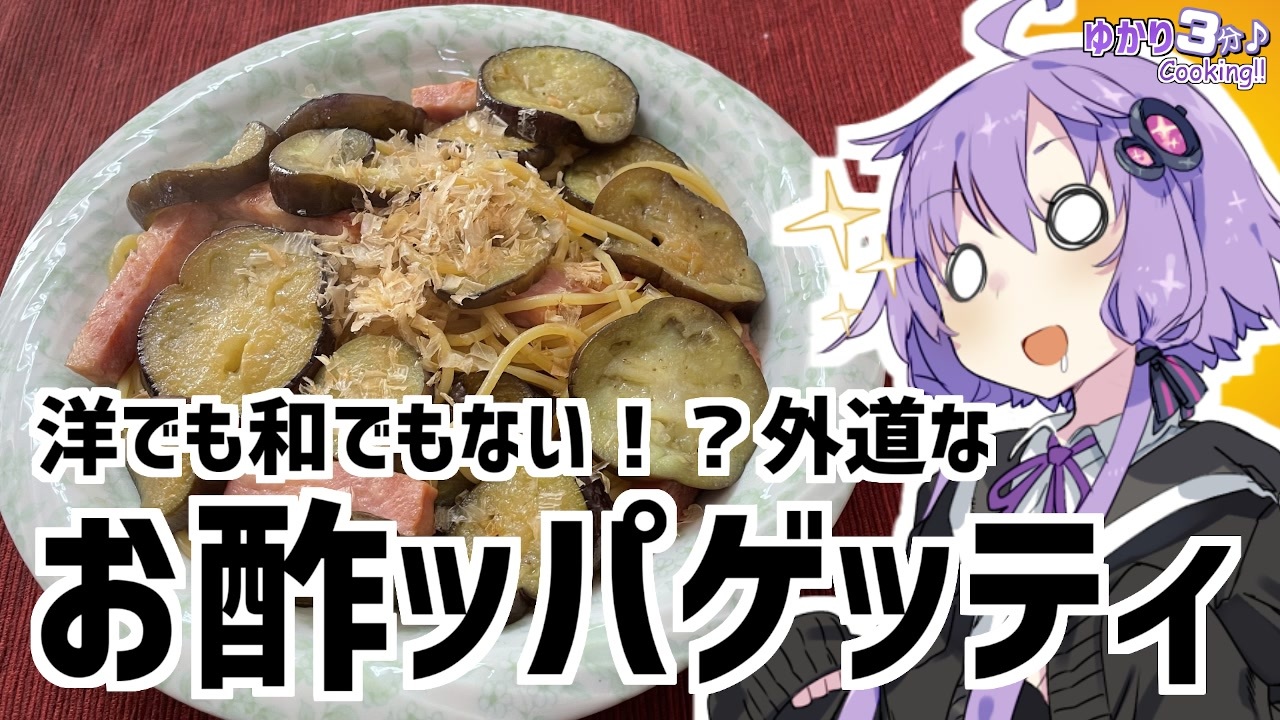 結月ゆかりを使用した料理動画です<br><br>木のフォークの使い心地は『いいね!』を押して確認してくれよな!<br><br>今回使用した材料<br><一人分><br>スパゲッティ:1人分 茄子:1本<br>ベーコン:50g しょう油:大さじ1<br>お酢:大さじ1 塩:少々<br>かつお節:あれば<br><br>投稿したイラスト (OИEちゃん投稿しました!):<a href="https://seiga.nicovideo.jp/seiga/im10891048" target="_blank" rel="noopener">im10891048</a><br>前回のジャガイモとひき肉のトマトチーズ焼き:<a href="https://www.nicovideo.jp/watch/sm39954869" class="watch">sm39954869</a><br>VOICEROID劇場 新訳猫町:<a href="https://www.nicovideo.jp/watch/sm39506126" class="watch">sm39506126</a><br>やっと完結したJK旅京都お花見編:<a href="https://www.nicovideo.jp/watch/sm39639517" class="watch">sm39639517</a><br><br>オススメのボイロ劇場<br>茜ちゃんと葵ちゃんの現代怪異占い:<a href="https://www.nicovideo.jp/watch/sm38263500" class="watch">sm38263500</a><br><br>ツイッター:<a href="https://twitter.com/mrt89244817" target="_blank" rel="noopener nofollow">https://twitter.com/mrt89244817</a>