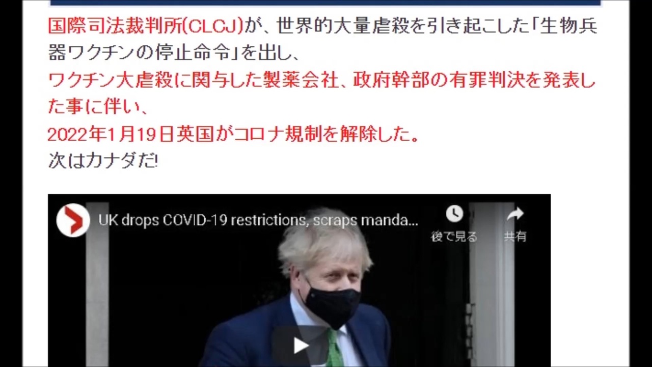 引用元<br>Journalist GalaxyUnion<br><a href="https://ameblo.jp/journalist-galaxyunion/entry-12722299787.html" target="_blank" rel="noopener nofollow">https://ameblo.jp/journalist-galaxyunion/entry-12722299787.html</a><br>原文<br><a href="https://tapnewswire.com/2022/01/jan-19-22-britain-lifts-covid-restrictions-canada-next/" target="_blank" rel="noopener nofollow">https://tapnewswire.com/2022/01/jan-19-22-britain-lifts-covid-restrictions-canada-next/</a><br><br />日月神示に<br>『「死ぬことで助ける」と「生かすことで助ける」の状況はあるが‥』との表現があります<br>これから先(12年程度)の辛苦さを示しているとも思えます<br>『食糧難の混乱、無政府状態から同胞を食する人まで現れる』とも<br>今日明日の食事で死を覚悟しなければならない家族と、ある程度(食について)安泰な人が混在した時、一体何が起こるだろうか<br>"今だけ" の駄賃を貰ってDS側に付いている人は、自らの行いがより強烈な地獄に向かわせていることに気付いて欲しい<br><br>ロックフェラーやロスチャイルドでさえ、そんな地獄の様相の上に立てたとて、果たして幸福や安泰で居られるだろうか<br>日月には『空を飛ぶ人と地を這う人に分かれる』とあった<br>移動には航空機を使って(会合を)回避するのかも知れないが、一歩外を見回せば地獄‥<br>そんな世界を標榜する‥ 今の時点で既に狂気としか思えない<br>今ある豊かさや文化などたちまち崩壊するだろうし、航空機を製造維持するコミュニティーなど数万人で出来る訳がない<br>十億人を残すと目論んでいるのかも知れないが、殆どがゾンビのような体(脳を含めて)では墜落が頻発するものしか造れないだろう<br><br>一方、『死ぬことで助ける』という側面があるなら‥<br>何が正しく何がそうでないのか‥<br>確かに強弁(自らは正しいと思い込むこと)そのものがより悲惨をもたらすことも‥<br>それらの側面というのは、同一平面というより上下の関係になっていることの方が多そうだ<br>余りに上の立場からの側面など、英知吸収の途上からは認識しようがない<br><br><br>このIDはウクライナ関連動画(複数)でアカウント制限(投稿不可)になったため別アカを作りました<br><a href="https://www.nicovideo.jp/user/126388289" target="_blank" rel="noopener nofollow">https://www.nicovideo.jp/user/126388289</a>