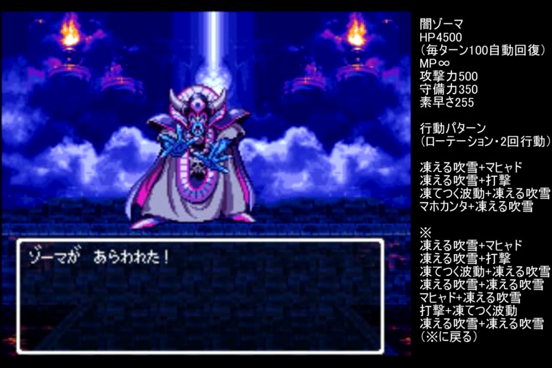 コメント返しが少々遅くなりましたが『本数の関係が緩和されたみたいなのでニコニコでも無編集版見てみたいです』というリクエストにお応えして闇ゾーマ戦を再放送。<br>改めて見ると完全に豪運任せな戦闘でしたが、一応対処法を三つ残していました。<br><br>①1から吟味やり直し<br>②自主封印のあなほり解禁<br>③FANBOXで紹介した最終兵器<br><br>…………詰まないとはいえ、どれも地獄の選択でしたね。<br>それと本編では最後に勝ち確と言ってましたが、先行モシャスしたら負けてました。ゾーマコワイ。<br><br><br>前→<a href="https://www.nicovideo.jp/watch/sm38700853" class="watch">sm38700853</a>(本編) 次→<a href="https://www.nicovideo.jp/watch/sm38734851" class="watch">sm38734851</a>(DQⅣへ)<br><br>YouTube版→<a href="https://youtu.be/uPztYR6kI6g" target="_blank" rel="noopener nofollow">https://youtu.be/uPztYR6kI6g</a><br><br><br>※動画の大きさが変わる方は、お手数ですが設定→画質を自動から〇pに変えると解決します。<br>※一部機種は互換機を使用してのプレイとなります。<br><br>縛りルール(不明点はシリーズのQ&Aを参照)<br>①使った武器・防具・装飾品・道具・呪文・特技・一部特殊施設(メダル王・カジノ・移民の町)・職業(3,6,7)・仲間モンスター(4,5,6,8+7の職業)は次以降のシリーズで使用禁止。<br>(NPCキャラが使用した装備や呪文を含む。売却及び錬金素材としても使用扱い)<br><br>②裏技・バグ技の禁止。<br><br>③逃走禁止&戦闘終了時は全員生存。<br><br>④レベルを上げ過ぎない。<br>ダンジョンやボスは公式ガイドブックに記載されたレベル+3まで。<br>ラスボスは全ての呪文を習得するレベル+3程度までに収める。<br><br>⑤裏ボスも規定回数、規定ターン以内に倒す。<br>(6の裏ダンジョン突入時のみ、条件を満たすため①の職業を解禁)<br><br>(おまけ)<br>宝は可能なものに限り全回収。<br>5と6は同一モンスターの仲間不可。<br>回避可能なボスも全て倒す。<br><br><br>この動画で利用している株式会社スクウェア・エニックスを代表とする共同著作者が権利を所有する著作物及びスギヤマ工房有限会社が権利を所有する楽曲の転載・配布は禁止いたします。<br>(C) ARMOR PROJECT/BIRD STUDIO/SQUARE ENIX All Rights Reserved.<br>(C) SUGIYAMA KOBO (P) SUGIYAMA KOBO<br /><br><br>❤いいねを押していただけるとモチベーションと投稿速度が上がるので宜しくお願い致します!<br><br>作者ツイッター→ <a href="https://twitter.com/nig0117" target="_blank" rel="noopener nofollow">https://twitter.com/nig0117</a><br>PIXIV FANBOX→ <a href="https://sutanokeiji.fanbox.cc/" target="_blank" rel="noopener nofollow">https://sutanokeiji.fanbox.cc/</a><br><br>( 以前はWEB小説書いてました→ <a href="https://kakuyomu.jp/works/1177354054884910267" target="_blank" rel="noopener nofollow">https://kakuyomu.jp/works/1177354054884910267</a> )