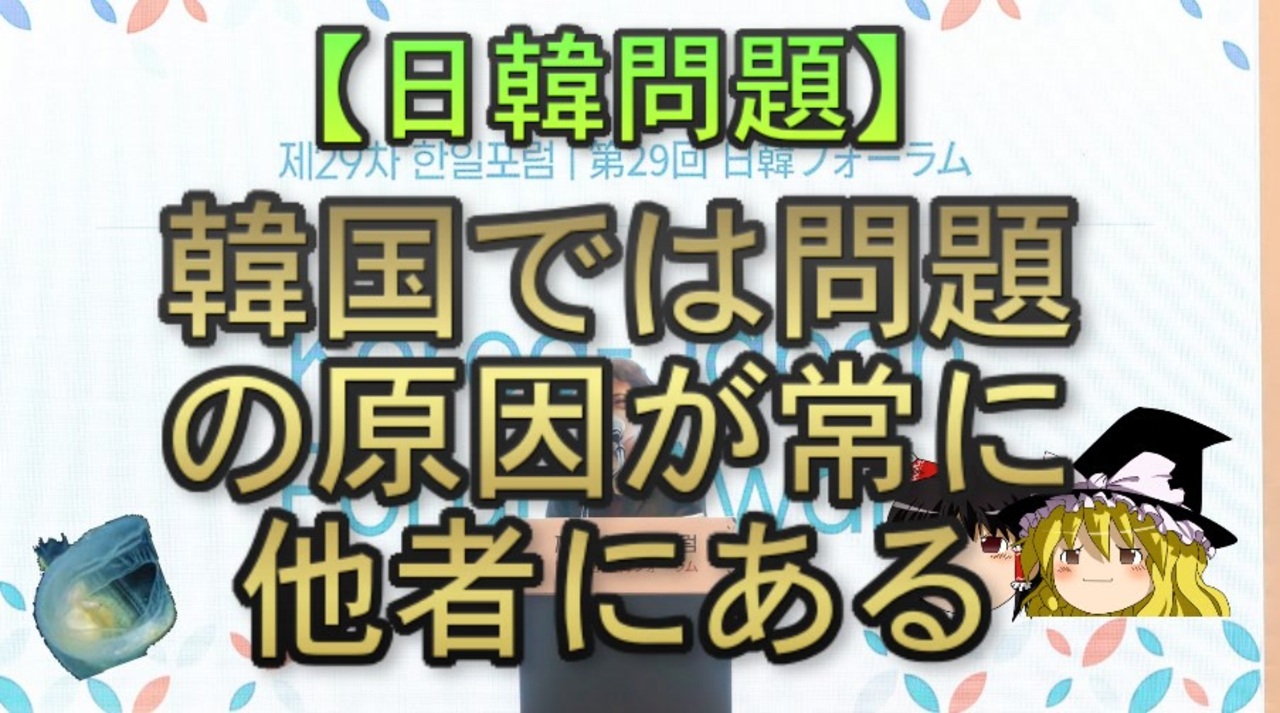 さて、本日は自らが引き起こした問題を他者に解決させようとする韓国の特徴について扱っていきます。<br>エンコード終了直前に誤ってタコ足コード引っこ抜き事件<br><br>本日のブログ記事<br><a href="https://oogchib.hateblo.jp/entry/2022/02/06/020615" target="_blank" rel="noopener nofollow">https://oogchib.hateblo.jp/entry/2022/02/06/020615</a><br><br>元記事<br>韓国は「日本側が関係改善に向けた努力をするべき」と考えている<br><a href="https://oogchib.hateblo.jp/entry/ar935284" target="_blank" rel="noopener nofollow">https://oogchib.hateblo.jp/entry/ar935284</a><br>常に他力本願な韓国<br><a href="https://oogchib.hateblo.jp/entry/2021/12/30/010659" target="_blank" rel="noopener nofollow">https://oogchib.hateblo.jp/entry/2021/12/30/010659</a><br><br>関連動画<br>【日韓問題】韓国独特の「おかげ」と「せい」<br><a href="https://www.nicovideo.jp/watch/sm32431395" class="watch">sm32431395</a><br>【日韓問題】日韓で異なる「責任」の概念<br><a href="https://www.nicovideo.jp/watch/sm35269330" class="watch">sm35269330</a><br>【日韓問題】日韓で異なる「正しさ」の概念 前編<br><a href="https://www.nicovideo.jp/watch/sm31616028" class="watch">sm31616028</a><br>ゆっくり解説】韓国と対話が成り立たない理由 part1/3<br><a href="https://www.nicovideo.jp/watch/sm37853141" class="watch">sm37853141</a><br>ゆっくり解説】韓国は徹底した序列社会<br><a href="https://www.nicovideo.jp/watch/sm39938892" class="watch">sm39938892</a><br>【日韓問題】韓国の「恨(ハン)」とは何?<br><a href="https://www.nicovideo.jp/watch/sm32098678" class="watch">sm32098678</a><br><br>引用ソースと動画のテキストをブログ日韓問題(初心者向け)のほうへ掲載しています。<br><br>日韓問題(初心者向け)<br><a href="https://oogchib.hateblo.jp/" target="_blank" rel="noopener nofollow">https://oogchib.hateblo.jp/</a><br>移転前旧ブログ<br><a href="https://ch.nicovideo.jp/ooguchib/blomaga" target="_blank" rel="noopener nofollow">https://ch.nicovideo.jp/ooguchib/blomaga</a><br><br>暇つぶしにどうぞ<br><a href="http://ooguchib.blog.fc2.com/" target="_blank" rel="noopener nofollow">http://ooguchib.blog.fc2.com/</a> <br><br>twitter @ooguchib<br><a href="https://twitter.com/ooguchib" target="_blank" rel="noopener nofollow">https://twitter.com/ooguchib</a><br><br>前 <a href="https://www.nicovideo.jp/watch/sm39965369" class="watch">sm39965369</a> <a href="https://www.nicovideo.jp/mylist/59069876" target="_blank" rel="noopener">mylist/59069876</a> 次回 <a href="https://www.nicovideo.jp/watch/sm40033282" class="watch">sm40033282</a><br><br>番外編マイリスト<br><a href="https://www.nicovideo.jp/mylist/62992608" target="_blank" rel="noopener">mylist/62992608</a><br><br>YouTube版<br><a href="https://youtu.be/9Jlr6BChjFM" target="_blank" rel="noopener nofollow">https://youtu.be/9Jlr6BChjFM</a><br>