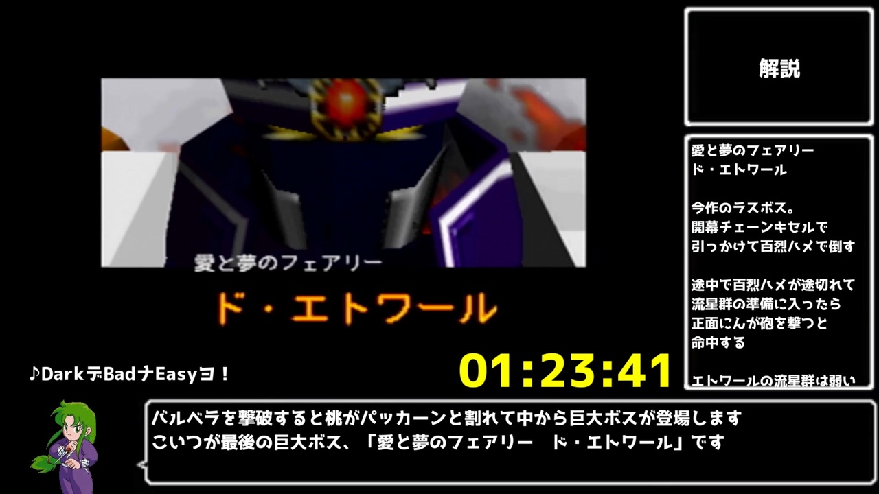 前⇒<a href="https://www.nicovideo.jp/watch/sm39965266" class="watch">sm39965266</a><br>マイリスト⇒<a href="https://www.nicovideo.jp/mylist/72170340" target="_blank" rel="noopener">mylist/72170340</a><br><br>ミュージカル城突入~ゲームクリアまで<br>今回が最終回となります、ここまでご視聴ありがとうございました!<br>また別の解説動画を見に来ていただけると嬉しいです!<br><br>計測開始:ゲームをリセットした瞬間<br>計測終了:ラスボスのド・エトワールを撃破し画面がホワイトアウトした瞬間<br><br>普段はTwitch( <a href="https://www.twitch.tv/koryuta_dayo" target="_blank" rel="noopener nofollow">https://www.twitch.tv/koryuta_dayo</a> )にてRTA配信をやっています<br>この動画をきっかけに、普段のRTA配信にも興味を持っていただけたら幸いです<br><br>ゴエモンRTA用のdiscordのサーバーを作ってみました!<br>(64作品が主ですが)ゴエモンRTAについて詳しく知りたい方はご利用ください!<br>⇒<a href="https://discord.gg/s2dV7XjPJS" target="_blank" rel="noopener nofollow">https://discord.gg/s2dV7XjPJS</a><br><br>