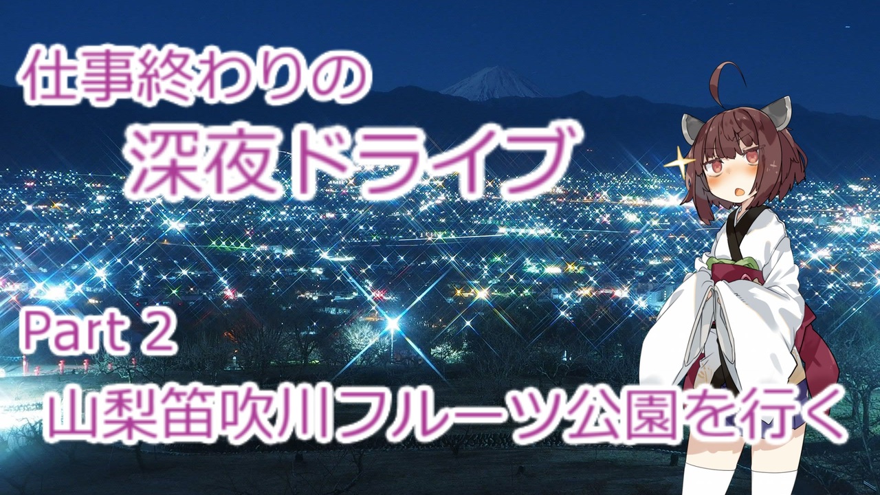 こんばんは、山葱(やまそう)と申します。<br><br>ドライブばっかり行って動画だけがたまっていく<br>そんな気分転換ばかりしています。<br><br>ということで第2弾の動画となります。<br>前回よりも動きだったりBGM買えたりと色々手を加えております。<br>こういう動画にしてほしい!という要望あれば是非コメントなどいただけるとうれしいです!<br><br>もしよければこの動画を楽しんでいってください。<br>今回は山梨のフルーツ公園での夜景撮影を目指してを走ります。<br><br>前回の動画について多くの再生、コメント、いいねありがとうございました。<br>興味がありましたら是非前回の動画もご覧ください。<br><br>前: <a href="https://www.nicovideo.jp/watch/sm39943343" class="watch">sm39943343</a><br>次: まだない(今月中にはもう一本・・)<br><br>〇写真<br><a href="https://twitter.com/yamasou2565/status/1526553722318270465?s=20&t=NlBbQf8KyWnftDJIKzJdhA" target="_blank" rel="noopener nofollow">https://twitter.com/yamasou2565/status/1526553722318270465?s=20&t=NlBbQf8KyWnftDJIKzJdhA</a><br><br>〇前回広告してくださった皆様<br>もやソル さん<br>コウ さん<br>近江提督 さん<br>TAROKAZU さん<br>panra さん<br>2568 さん<br>キノコマン さん<br>esk さん<br>はいぱーあんくる さん<br>稲なんとか さん<br>ゴーマゲドン さん<br>雪いるか さん<br>匿名係長ただの人 さん<br>雪楓 さん<br>百舌鳥 さん<br>しずん さん<br>ゆーり さん<br>hitaka さん<br>アカツキ さん<br>通りすがり さん<br><br>広告ありがとうございました!<br>励みになるのでとてもうれしいです!<br><br>----<br><br>〇Twitter<br><a href="https://twitter.com/yamasou2565" target="_blank" rel="noopener nofollow">https://twitter.com/yamasou2565</a><br><br>〇youtube版<br><a href="https://youtu.be/j9lelnD6PFQ" target="_blank" rel="noopener nofollow">https://youtu.be/j9lelnD6PFQ</a><br><br>〇編集<br>AviUtl<br><br>〇お借りしたもの<br>立ち絵:<br>・からい様<br><a href="https://seiga.nicovideo.jp/seiga/im7760810" target="_blank" rel="noopener">im7760810</a><br><br>BGM:<br>・しんさんわーくす様 / 星降る夜<br><a href="https://commons.nicovideo.jp/works/nc117631" target="_blank" rel="noopener">nc117631</a><br><br>・Sound Bound様 / カメラ シャッター音 効果音SoundBound<br><a href="https://commons.nicovideo.jp/works/nc236254" target="_blank" rel="noopener">nc236254</a><br><a href="https://soundbound.net/" target="_blank" rel="noopener nofollow">https://soundbound.net/</a><br><br>・Masa_Charcoal様 / 深夜っぽいBGM (Lofi hiphop)<br><a href="https://commons.nicovideo.jp/works/nc219661" target="_blank" rel="noopener">nc219661</a><br>
