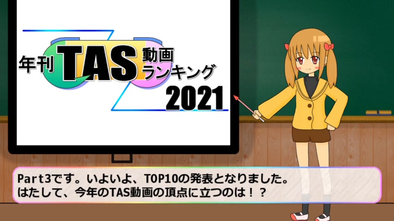 Part3です。<br><br>※TASと関係のない動画が投稿されている件ですが、<a href="https://ch.nicovideo.jp/article/ar504036" target="_blank" rel="noopener">ar504036</a>に対策を載せています。<br><br>※代理ちゃんは時間感覚がおかしいので、動画内で2021年のことを「今年」などと言っております。表現が分かりづらいことを謹んでお詫び申し上げます。<br><br>集計日時:2021年12月25日23時59分<br>集計対象:2020年12月25日~2021年12月25日の間に投稿された動画。<br>集計結果:<a href="https://www.nicovideo.jp/mylist/72704534" target="_blank" rel="noopener">mylist/72704534</a> 総合バックナンバー:<a href="https://www.nicovideo.jp/mylist/37739083" target="_blank" rel="noopener">mylist/37739083</a><br><br>今回も3パートに分けております。<br>Part1:<a href="https://www.nicovideo.jp/watch/sm40017896" class="watch">sm40017896</a> Part2:<a href="https://www.nicovideo.jp/watch/sm40021150" class="watch">sm40021150</a> Part3:ここ<br><br /><strong>※TASランでは制作のお手伝いを募集しております。<br> 詳細はこちら → <a href="https://heikin.hatenablog.com/entry/ar282358" target="_blank" rel="noopener nofollow">https://heikin.hatenablog.com/entry/ar282358</a></strong><br><br>[PR]<strong>Discordで、TAS好きの人たちがわいわいするところを作ってみました。<br> ゆるふわまったりをモットーにTASさんもそうじゃない人も集まってみましょう(>ヮ<)<br> <a href="https://discord.gg/xG2VymYNTV" target="_blank" rel="noopener nofollow">https://discord.gg/xG2VymYNTV</a></strong>