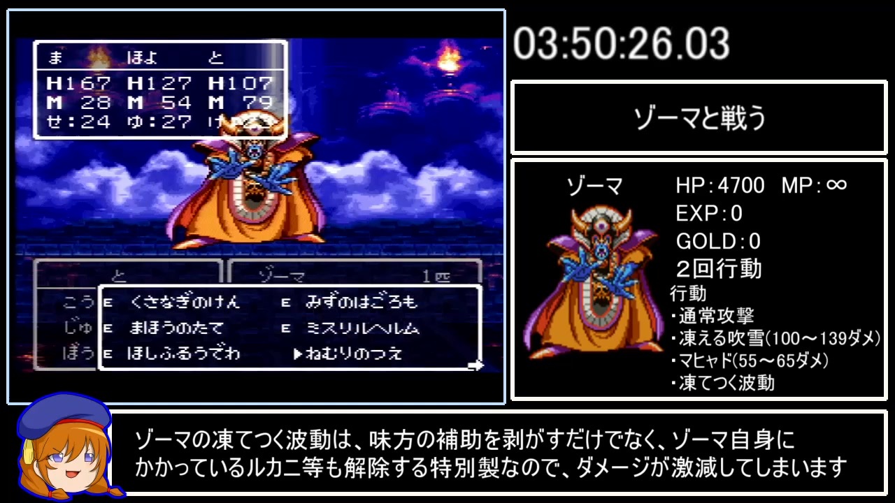 ネタばれあり。<br><br>SFC版ドラゴンクエスト3の縛りRTAです。<br>ルールは以下の通り。<br><br>ルール<br>1. アイテム増殖バグの使用禁止<br>2. パーティーの人数は3人まで<br>3. タイム計測区間は電源投入からTO BE CONTINUED TO DRAGON QUESTⅠ・Ⅱ表示 まで<br><br>インターレース解除がうまくいかず少し見づらいですが許してください。<br><br><a href="https://www.nicovideo.jp/watch/sm39971251" class="watch">sm39971251</a>←Part5<br>Part1→<a href="https://www.nicovideo.jp/watch/sm39738355" class="watch">sm39738355</a><br><br>youtube版→<a href="https://youtube.com/playlist?list=PLEWji-wnXssg_0xW-_JkNgM0dGGVuZ9Mk" target="_blank" rel="noopener nofollow">https://youtube.com/playlist?list=PLEWji-wnXssg_0xW-_JkNgM0dGGVuZ9Mk</a><br><br>全然つぶやかないツイッター<br><a href="https://twitter.com/Hakusai_kkmsn" target="_blank" rel="noopener nofollow">https://twitter.com/Hakusai_kkmsn</a><br><br>この動画で利用している株式会社スクウェア・エニックスを代表とする共同著作者が権利を所有する著作物及びスギヤマ工房有限会社が権利を所有する楽曲の転載・配布は禁止いたします。<br>© 1995 ARMOR PROJECT/BIRD STUDIO/HEART BEAT/SQUARE ENIX All Rights Reserved.<br>© SUGIYAMA KOBO